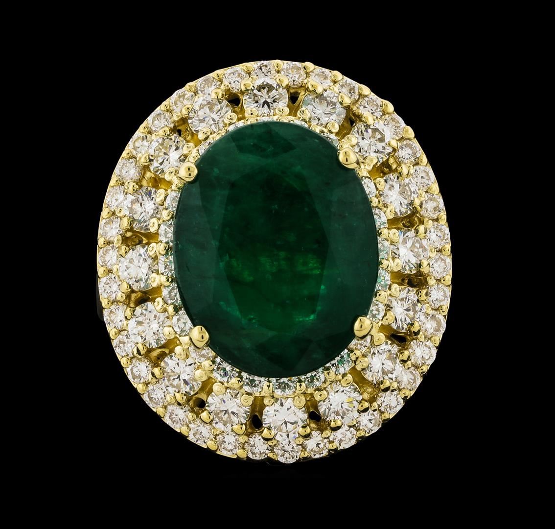 One electronically tested 14KT yellow gold lady's cast fashion ring with a triple basket halo with a bright polish finish. The featured lady's ring has a shank measuring 3.75 millimeters wide. Identified with markings of 'K14'. Condition is new, good workmanship. Containing: One prong set oval modified mixed cut natural emerald, measuring 13.84 x 11.04 x 6.50mm, (depth est.) 15%. bulge factor, approximate weight of 6.63ct., clarity is heavily included, medium dark, moderately strong, green color, (GIA G 6/4), cut is good. Transmitting light somewhat diffusely, semi-transparent to translucent. Naturally occurring internal & external characteristics are present. Indications of oil residue. Colored gemstones are presumed to have been subjected to commonly used enhancement processes. Graded in the setting. Sixteen prong set round brilliant cut diamonds, measuring 2.50 - 2.40 x 1.49mm (depth est.) approximate total weight of 16 Stones = 0.88ct. Graded in the setting. Clarity SI-1 to SI-2. Color: H - I Cut Good Sixty-Two prong set round brilliant cut diamonds, measuring 1.60 - 1.55 x 0.96mm (depth est.) approximate total weight of 62 Stones = 0.90ct. Graded in the setting. Clarity SI-1 to SI-2. Color: G - H Cut Good. Total Weight of Colored Stones 6.63ct.. Total Weight of Diamonds 1.78ct.. Total Weight of Ring 10.90gm GAS Appraised at $12,220.00.