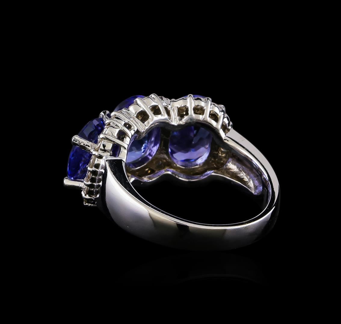 One electronically tested 14KT white gold ladies cast tanzanite and diamond ring with a bright polish finish. The ring features a tanzanite trio set within a diamond bezel supported by tapering shoulders, completed by a three millimeter wide band. Identified with markings of "K14". Condition is new, good workmanship. Containing: Three prong set oval mixed cut natural tanzanites, measuring 9.50 x 7.50 x 4.40mm, approximate total weight of 6.63ct., clarity is eye clean, type I, medium, slightly grayish, bluish violet color, (GIA bV 5/2), cut is good. Transmitting light with no distortion, transparent. Measurements & the color grade are an average for the group. Graded in the setting. Tanzanite is a very rare gemstone that is only found in the country of Tanzania. Originally discovered in 1967. Tiffany & Company, named the stone Tanzanite. It is found in the Usumburu Mountains that border the Umba Valley of northern Tanzania. Tanzanite occurs in gray, brown, violet, blue, reddish-purple, & green. The gem is interesting because of its exceptional pleochroism. Rotated in different directions a tanzanite will exhibit multiple changes of color. Tanzanite has a low tolerance to ultrasonic cleaning, and should not be cleaned using this method. Thirty-Two prong set round brilliant cut diamonds, measuring 1.80 - 1.80 x 1.08mm (depth est.) approximate total weight of 32 Stones = 0.72ct. Color & clarity grade are an average for the group. Graded in the setting. Clarity: SI-2 to I-1. Color: H - J. Total Weight of Colored Stones 6.63ct. Total Weight of Diamonds 0.72ct. Total Weight of Ring 8.97gm. AIG Appraised at $14,120.00.