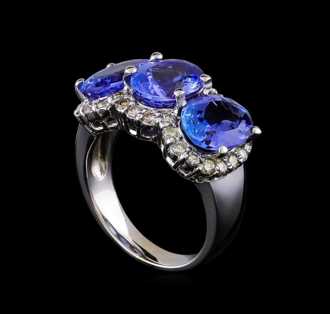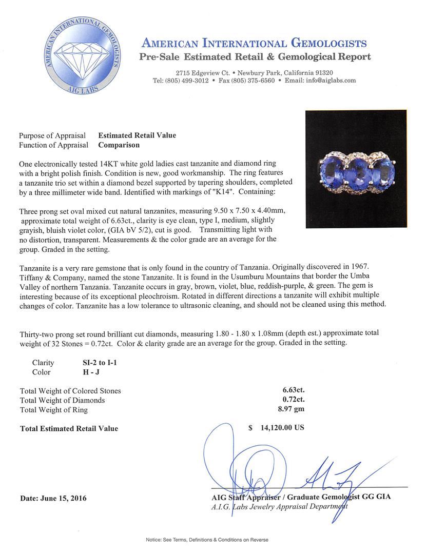 One electronically tested 14KT white gold ladies cast tanzanite and diamond ring with a bright polish finish. The ring features a tanzanite trio set within a diamond bezel supported by tapering shoulders, completed by a three millimeter wide band. Identified with markings of "K14". Condition is new, good workmanship. Containing: Three prong set oval mixed cut natural tanzanites, measuring 9.50 x 7.50 x 4.40mm, approximate total weight of 6.63ct., clarity is eye clean, type I, medium, slightly grayish, bluish violet color, (GIA bV 5/2), cut is good. Transmitting light with no distortion, transparent. Measurements & the color grade are an average for the group. Graded in the setting. Tanzanite is a very rare gemstone that is only found in the country of Tanzania. Originally discovered in 1967. Tiffany & Company, named the stone Tanzanite. It is found in the Usumburu Mountains that border the Umba Valley of northern Tanzania. Tanzanite occurs in gray, brown, violet, blue, reddish-purple, & green. The gem is interesting because of its exceptional pleochroism. Rotated in different directions a tanzanite will exhibit multiple changes of color. Tanzanite has a low tolerance to ultrasonic cleaning, and should not be cleaned using this method. Thirty-Two prong set round brilliant cut diamonds, measuring 1.80 - 1.80 x 1.08mm (depth est.) approximate total weight of 32 Stones = 0.72ct. Color & clarity grade are an average for the group. Graded in the setting. Clarity: SI-2 to I-1. Color: H - J. Total Weight of Colored Stones 6.63ct. Total Weight of Diamonds 0.72ct. Total Weight of Ring 8.97gm. AIG Appraised at $14,120.00.