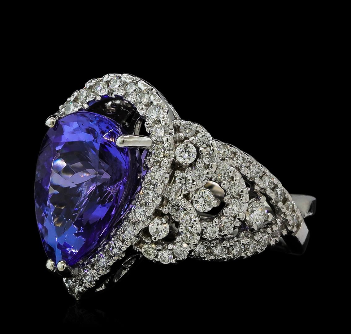 One electronically tested 14KT white gold lady's cast fashion ring with a crossover split shank with a halo with a bright polish finish. The featured lady's ring has a double shank measuring 5.05 millimeters wide. Identified with markings of 'K14'. Condition is new, good workmanship. Containing: One prong set pear modified brilliant cut natural tanzanite, measuring 13.30 x 9.95 x 7.50mm, (depth est.) approximate weight of 6.63ct., clarity is eye clean, medium, moderately strong, violet color, (GIA V 5/4), cut is very good. Transmitting light with no distortion, transparent. Colored gemstones are presumed to have been subjected to commonly used enhancement processes. Graded in the setting. Eight prong set round brilliant cut diamonds, measuring 2.30 - 1.80 x 1.23mm (depth est.) approximate total weight of 8 Stones = 0.21ct. Graded in the setting. Clarity SI-1 to I-1. Color: H - I Cut Good Twenty-Five prong set round brilliant cut diamonds, measuring 1.60 - 1.55 x 0.98mm (depth est.) approximate total weight of 25 Stones = 0.37ct. Graded in the setting. Clarity SI-1 to I-1. Color: H - I Cut Good Fifty-Eight prong set round brilliant cut diamonds, measuring 1.40 - 1.35 x 0.86mm (depth est.) approximate total weight of 58 Stones = 0.58ct. Graded in the setting. Clarity SI-1 to SI-2. Color: H - I Cut Good. Total Weight of Colored Stones 6.63ct.. Total Weight of Diamonds 1.16ct.. Total Weight of Ring 10.00gm. GAS Appraised at $14,605.00.