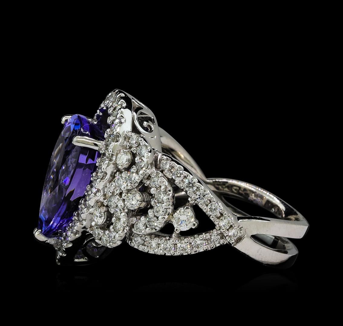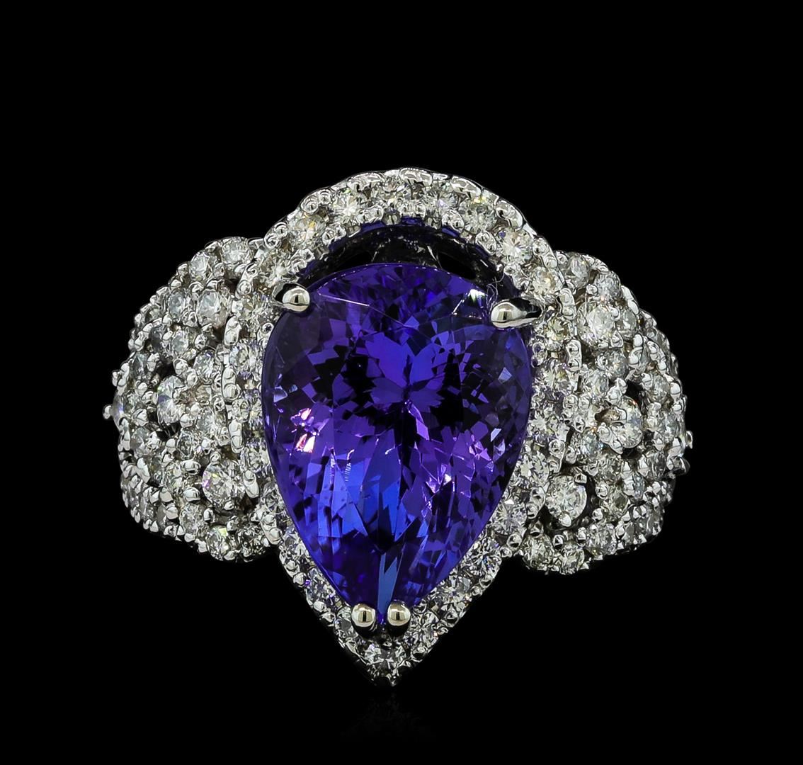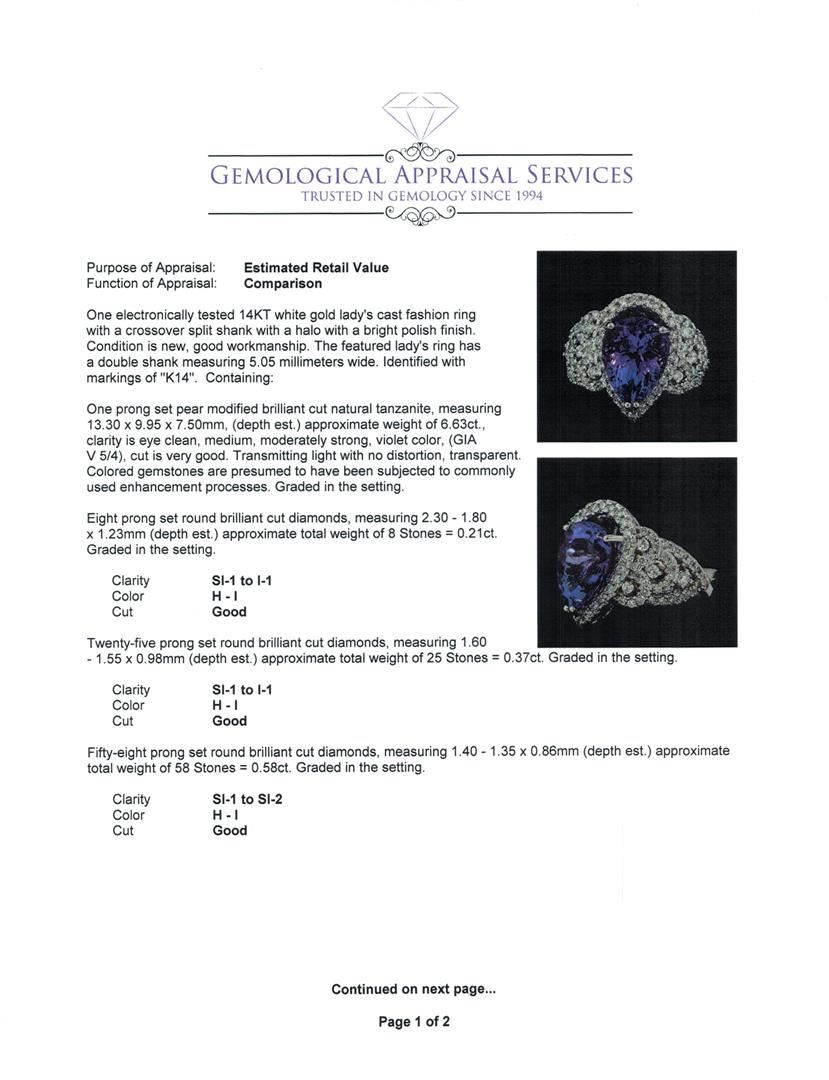 One electronically tested 14KT white gold lady's cast fashion ring with a crossover split shank with a halo with a bright polish finish. The featured lady's ring has a double shank measuring 5.05 millimeters wide. Identified with markings of 'K14'. Condition is new, good workmanship. Containing: One prong set pear modified brilliant cut natural tanzanite, measuring 13.30 x 9.95 x 7.50mm, (depth est.) approximate weight of 6.63ct., clarity is eye clean, medium, moderately strong, violet color, (GIA V 5/4), cut is very good. Transmitting light with no distortion, transparent. Colored gemstones are presumed to have been subjected to commonly used enhancement processes. Graded in the setting. Eight prong set round brilliant cut diamonds, measuring 2.30 - 1.80 x 1.23mm (depth est.) approximate total weight of 8 Stones = 0.21ct. Graded in the setting. Clarity SI-1 to I-1. Color: H - I Cut Good Twenty-Five prong set round brilliant cut diamonds, measuring 1.60 - 1.55 x 0.98mm (depth est.) approximate total weight of 25 Stones = 0.37ct. Graded in the setting. Clarity SI-1 to I-1. Color: H - I Cut Good Fifty-Eight prong set round brilliant cut diamonds, measuring 1.40 - 1.35 x 0.86mm (depth est.) approximate total weight of 58 Stones = 0.58ct. Graded in the setting. Clarity SI-1 to SI-2. Color: H - I Cut Good. Total Weight of Colored Stones 6.63ct.. Total Weight of Diamonds 1.16ct.. Total Weight of Ring 10.00gm. GAS Appraised at $14,605.00.