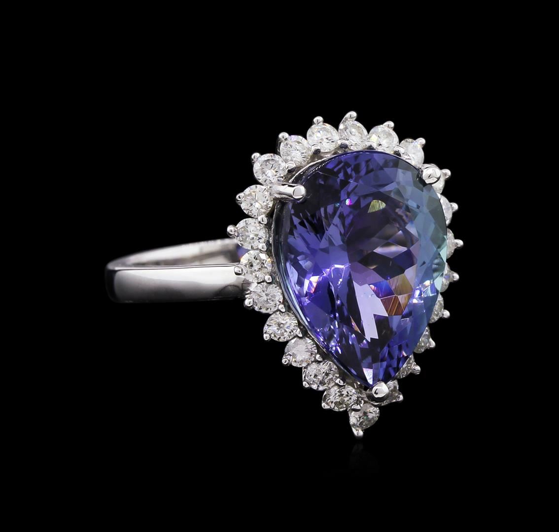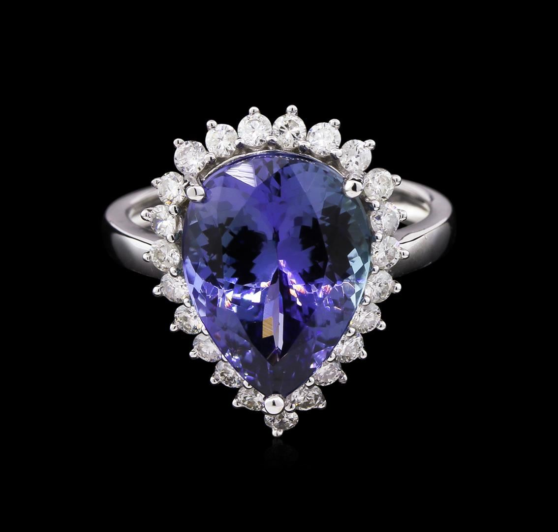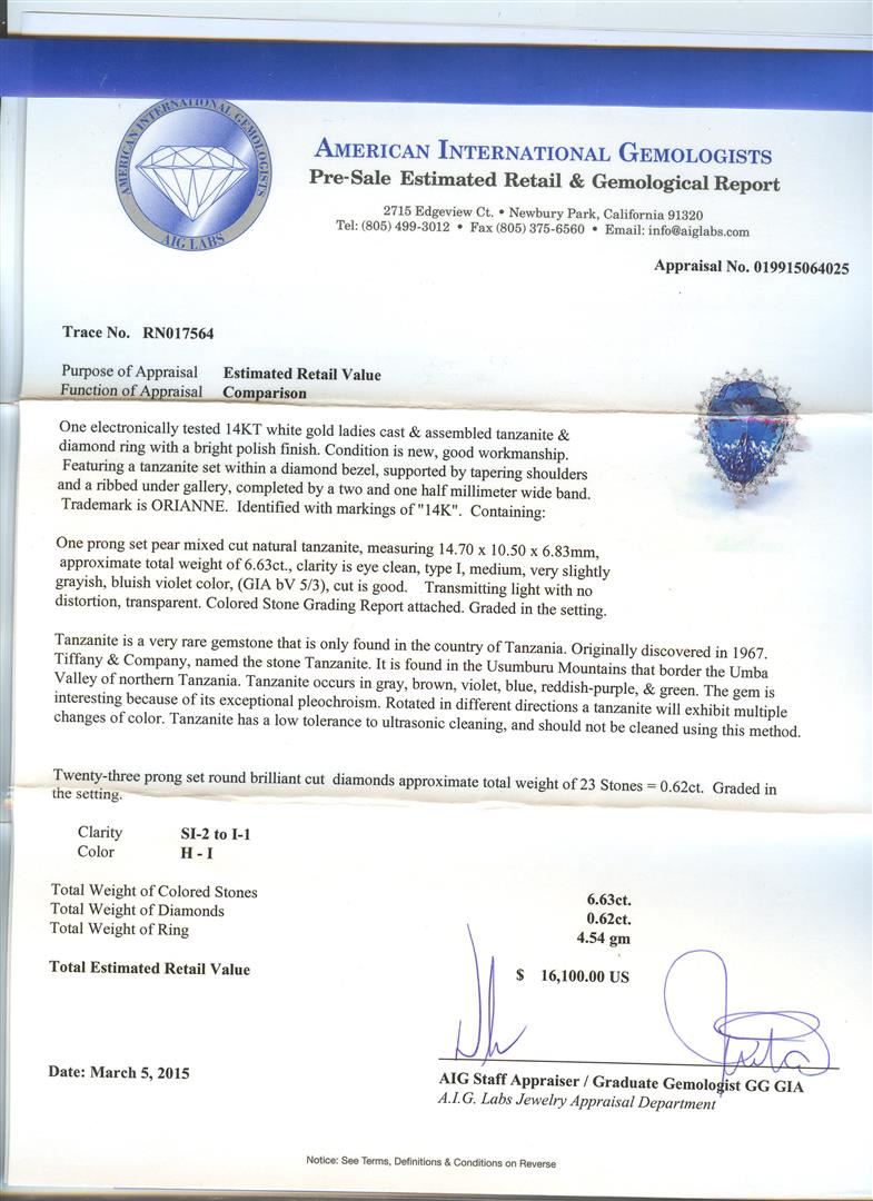 One electronically tested 14KT white gold ladies cast & assembled tanzanite & diamond ring with a bright polish finish. Featuring a tanzanite set within a diamond bezel, supported by tapering shoulders and a ribbed under gallery, completed by a two and one half millimeter wide band. Trademark is ORIANNE. Identified with markings of "14K". Condition is new, good workmanship. Containing: One prong set pear mixed cut natural tanzanite, measuring 14.70 x 10.50 x 6.83mm, approximate total weight of 6.63ct., clarity is eye clean, type I, medium, very slightly grayish, bluish violet color, (GIA bV 5/3), cut is good. Transmitting light with no distortion, transparent. Colored Stone Grading Report attached. Graded in the setting. Tanzanite is a very rare gemstone that is only found in the country of Tanzania. Originally discovered in 1967. Tiffany & Company, named the stone Tanzanite. It is found in the Usumburu Mountains that border the Umba Valley of northern Tanzania. Tanzanite occurs in gray, brown, violet, blue, reddish-purple, & green. The gem is interesting because of its exceptional pleochroism. Rotated in different directions a tanzanite will exhibit multiple changes of color. Tanzanite has a low tolerance to ultrasonic cleaning, and should not be cleaned using this method. Twenty-Three prong set round brilliant cut diamonds approximate total weight of 23 Stones = 0.62ct. Graded in the setting. Clarity: SI-2 to I-1. Color: H - I. Total Weight of Colored Stones 6.63ct. Total Weight of Diamonds 0.62ct. AIG Appraised at $16,100.00.