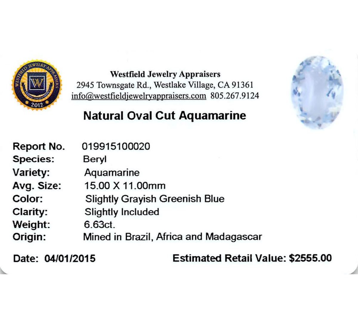 One oval cut natural aquamarine exact weight 6.63ct., clarity is slightly included, type I, medium, slightly grayish, very slightly greenish blue color, (GIA vslgB 5/2), cut is good. Westfield Appraised at $2,555.00.