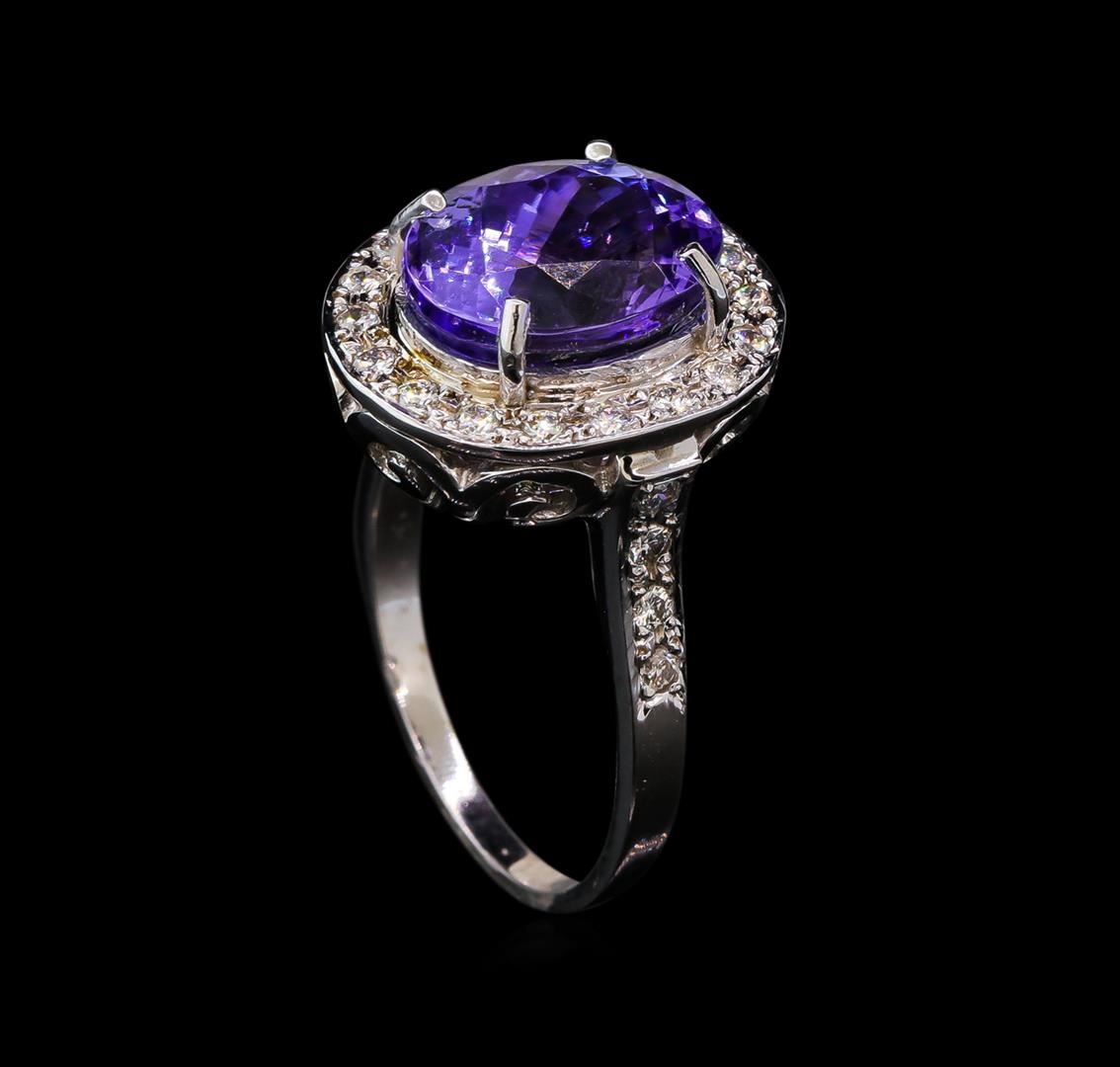 One electronically tested 14KT white gold lady's cast fashion ring with a basket halo with a bright polish finish. The featured lady's ring has a shank measuring 1.68 millimeters wide. Identified with markings of '14K'. Condition is new, good workmanship. Containing: One prong set oval modified brilliant cut natural tanzanite, measuring 11.92 x 9.69 x 7.93mm, (depth est.) 3%. bulge factor, approximate weight of 6.64ct., clarity is eye clean, medium, very slightly grayish, bluish violet color, (GIA bV 5/3), cut is very good. Transmitting light with no distortion, transparent. Colored gemstones are presumed to have been subjected to commonly used enhancement processes. Graded in the setting. Twenty-Six bead set round brilliant cut diamonds, measuring 1.70 - 1.60 x 1.02mm (depth est.) approximate total weight of 26 Stones = 0.45ct. Graded in the setting. Clarity SI-1 to SI-2. Color: G - I Cut Good. Total Weight of Colored Stones 6.64ct.. Total Weight of Diamonds 0.45ct.. Total Weight of Ring 7.10gm GAS Appraised at $12,085.00.