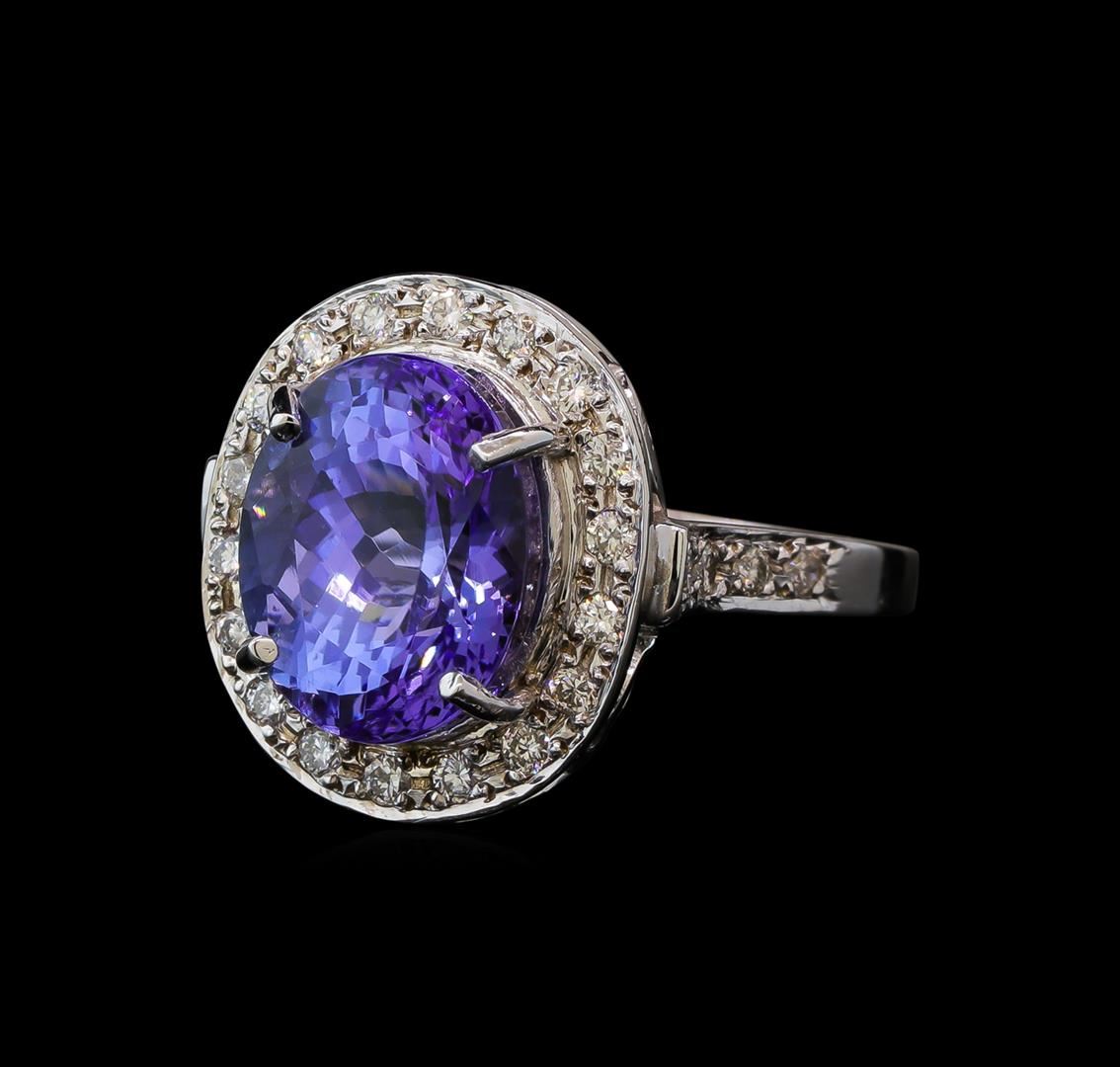 One electronically tested 14KT white gold lady's cast fashion ring with a basket halo with a bright polish finish. The featured lady's ring has a shank measuring 1.68 millimeters wide. Identified with markings of '14K'. Condition is new, good workmanship. Containing: One prong set oval modified brilliant cut natural tanzanite, measuring 11.92 x 9.69 x 7.93mm, (depth est.) 3%. bulge factor, approximate weight of 6.64ct., clarity is eye clean, medium, very slightly grayish, bluish violet color, (GIA bV 5/3), cut is very good. Transmitting light with no distortion, transparent. Colored gemstones are presumed to have been subjected to commonly used enhancement processes. Graded in the setting. Twenty-Six bead set round brilliant cut diamonds, measuring 1.70 - 1.60 x 1.02mm (depth est.) approximate total weight of 26 Stones = 0.45ct. Graded in the setting. Clarity SI-1 to SI-2. Color: G - I Cut Good. Total Weight of Colored Stones 6.64ct.. Total Weight of Diamonds 0.45ct.. Total Weight of Ring 7.10gm GAS Appraised at $12,085.00.