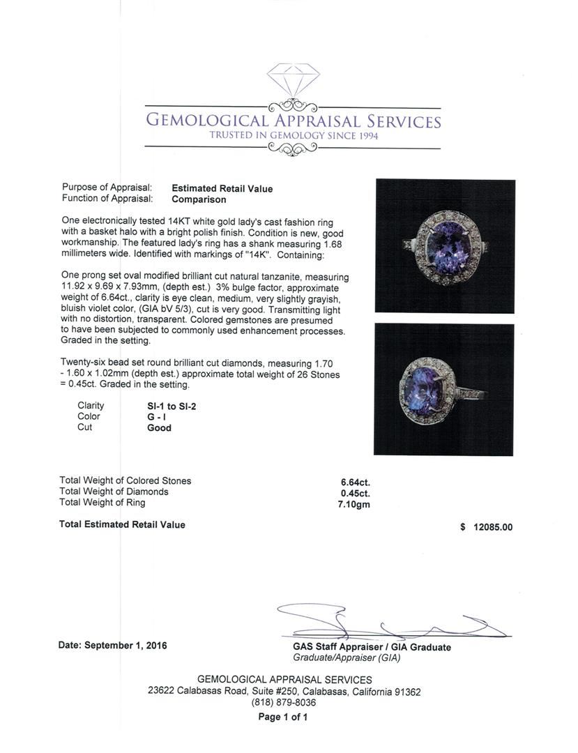 One electronically tested 14KT white gold lady's cast fashion ring with a basket halo with a bright polish finish. The featured lady's ring has a shank measuring 1.68 millimeters wide. Identified with markings of '14K'. Condition is new, good workmanship. Containing: One prong set oval modified brilliant cut natural tanzanite, measuring 11.92 x 9.69 x 7.93mm, (depth est.) 3%. bulge factor, approximate weight of 6.64ct., clarity is eye clean, medium, very slightly grayish, bluish violet color, (GIA bV 5/3), cut is very good. Transmitting light with no distortion, transparent. Colored gemstones are presumed to have been subjected to commonly used enhancement processes. Graded in the setting. Twenty-Six bead set round brilliant cut diamonds, measuring 1.70 - 1.60 x 1.02mm (depth est.) approximate total weight of 26 Stones = 0.45ct. Graded in the setting. Clarity SI-1 to SI-2. Color: G - I Cut Good. Total Weight of Colored Stones 6.64ct.. Total Weight of Diamonds 0.45ct.. Total Weight of Ring 7.10gm GAS Appraised at $12,085.00.