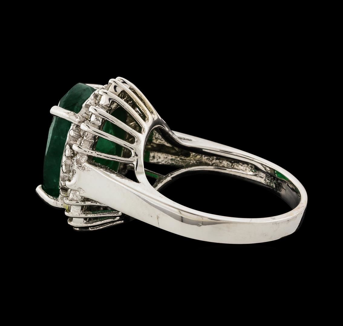 One electronically tested 14KT white gold lady's cast fashion ring with a basket halo with a bright polish finish. The featured lady's ring has a shank measuring 2.54 millimeters wide. Identified with markings of '14K'. Condition is new, good workmanship. Containing: One prong set oval modified mixed cut natural emerald, measuring 13.65 x 10.68 x 6.92mm, (depth est.) 15%. bulge factor, approximate weight of 6.65ct., clarity is heavily included, medium dark, moderately strong, green color, (GIA G 6/4), cut is good. Transmitting light somewhat diffusely, semi-transparent to translucent. Naturally occurring internal & external characteristics are present. Indications of oil residue. Colored gemstones are presumed to have been subjected to commonly used enhancement processes. Graded in the setting. Twenty-Two prong set round brilliant cut diamonds, measuring 1.90 - 1.85 x 1.15mm (depth est.) approximate total weight of 22 Stones = 0.54ct. Graded in the setting. Clarity SI-1 to SI-2. Color: G - H Cut Good. Total Weight of Colored Stones 6.65ct.. Total Weight of Diamonds 0.54ct.. Total Weight of Ring 7.50gm GAS Appraised at $8,070.00.