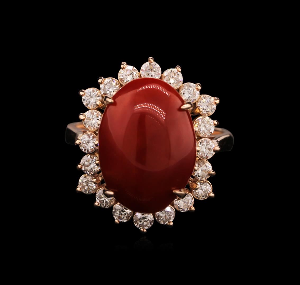 One ring featuring: 14KT rose gold weighing 4.83 grams containing one coral center stone with a total weight of 6.67ct and 20 diamonds with a total weight of 0.91ct.