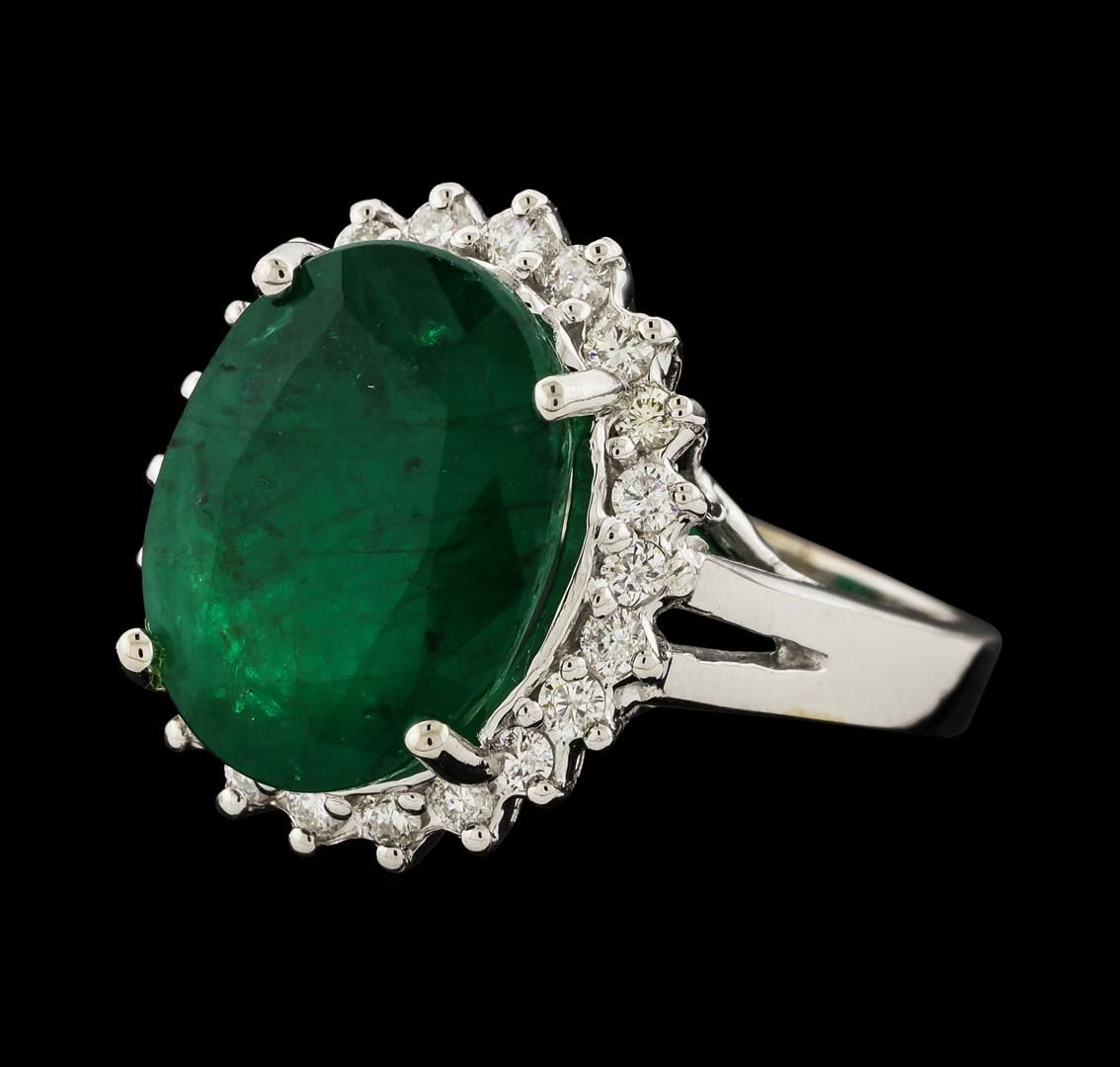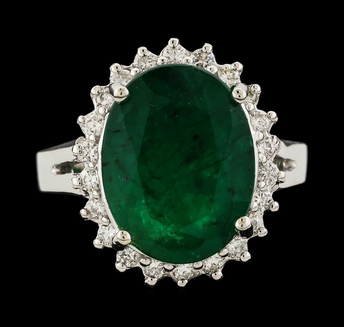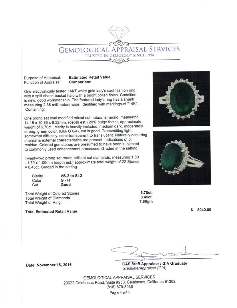 One electronically tested 14KT white gold lady's cast fashion ring with a split shank basket halo with a bright polish finish. The featured lady's ring has a shank measuring 2.38 millimeters wide. Identified with markings of '14K'. Condition is new, good workmanship. Containing: One prong set oval modified mixed cut natural emerald, measuring 14.15 x 10.85 x 6.32mm, (depth est.) 20%. bulge factor, approximate weight of 6.70ct., clarity is heavily included, medium dark, moderately strong, green color, (GIA G 6/4), cut is good. Transmitting light somewhat diffusely, semi-transparent to translucent. Naturally occurring internal & external characteristics are present. Indications of oil residue. Colored gemstones are presumed to have been subjected to commonly used enhancement processes. Graded in the setting. Twenty-Two prong set round brilliant cut diamonds, measuring 1.80 - 1.70 x 1.09mm (depth est.) approximate total weight of 22 Stones = 0.45ct. Graded in the setting. Clarity VS-2 to SI-2. Color: G - H Cut Good. Total Weight of Colored Stones 6.70ct.. Total Weight of Diamonds 0.45ct.. Total Weight of Ring 7.60gm. GAS Appraised at $8,040.00.