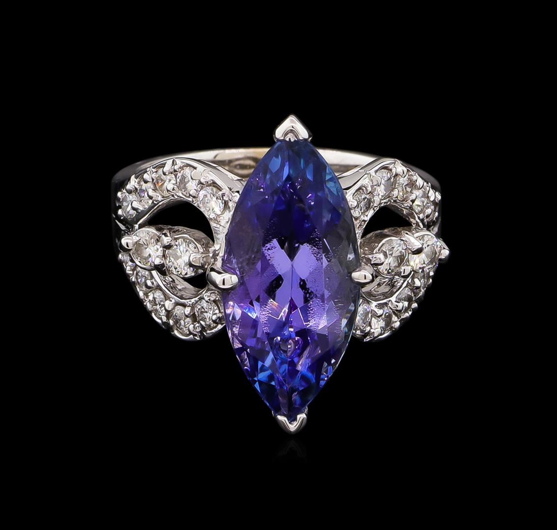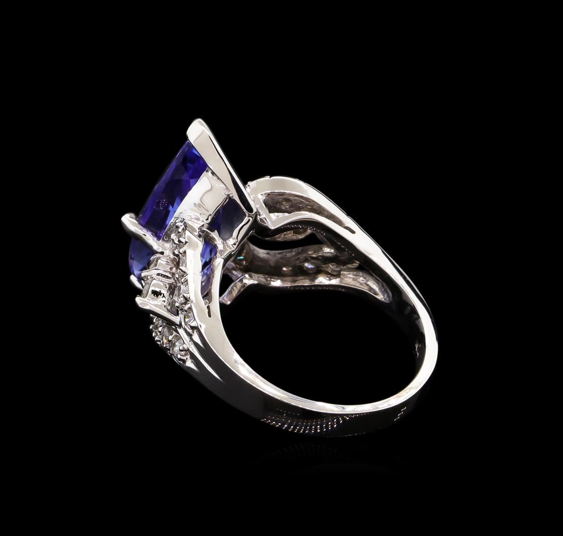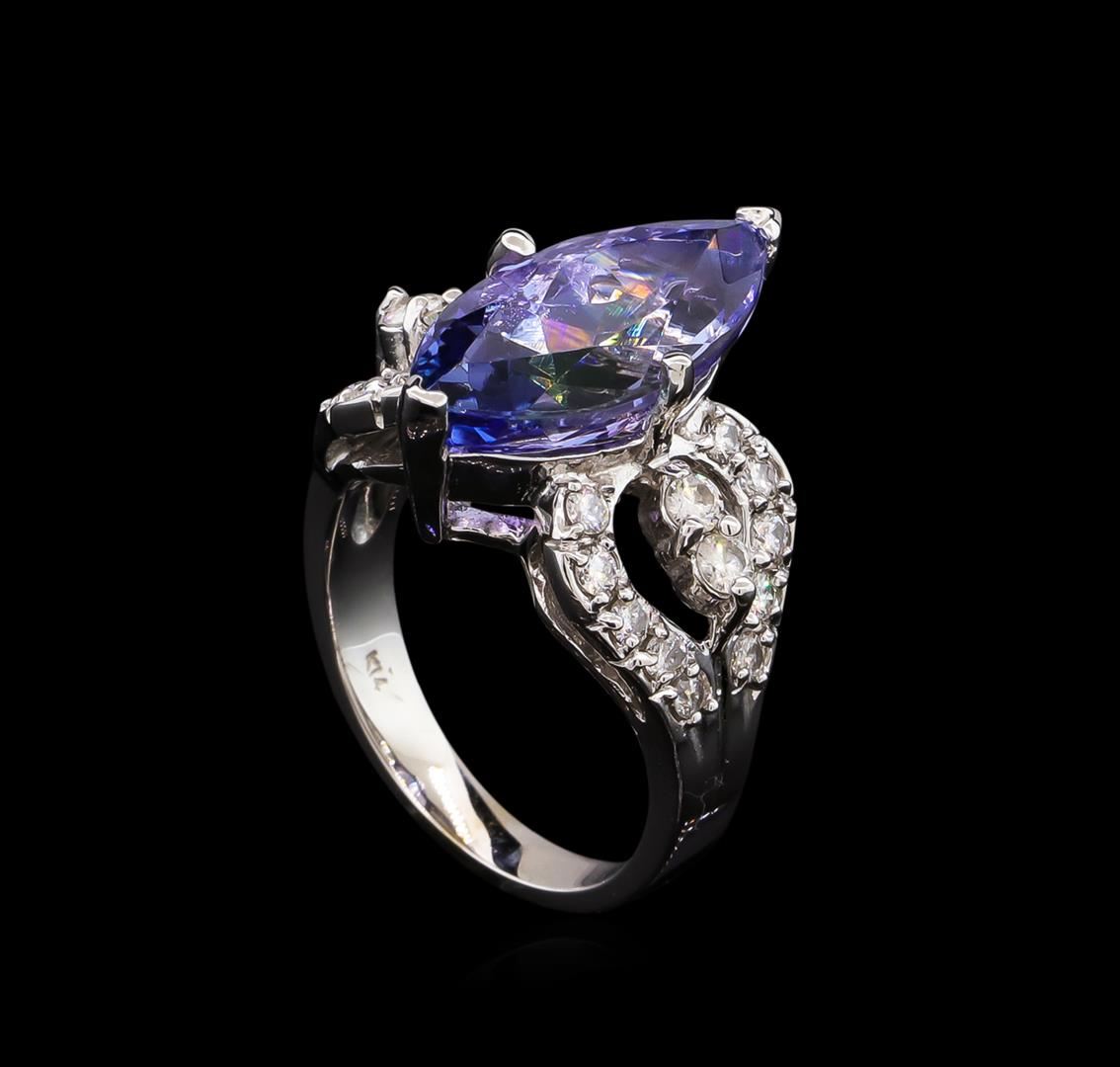 One electronically tested 14KT white gold lady's cast fashion ring with a split shank with a bright polish finish. The featured lady's ring has a shank measuring 3.01 millimeters wide. Identified with markings of "K14". Condition is new, good workmanship. Containing: One prong set marquise modified brilliant cut natural tanzanite, measuring 18.20 x 8.40 x 6.89mm, approximate weight of 6.70ct., clarity is eye clean, type I, medium light, moderately strong, violetish blue color, (GIA vB 4/4), cut is very good. Transmitting light with no distortion, transparent. Colored gemstones are presumed to have been subjected to commonly used enhancement processes. Graded in the setting. Twenty prong set round brilliant cut diamonds, measuring 1.90 - 1.80 x 1.15mm (depth est.) approximate total weight of 20 Stones = 0.49ct. Graded in the setting. Clarity: SI-1 to I-1. Color: G - Good Four prong set round brilliant cut diamonds, measuring 2.35 - 2.25 x 1.40mm (depth est.) approximate total weight of 4 Stones = 0.18ct. Graded in the setting. Clarity: SI-2 to I-1. Color: G - Good. Total Weight of Colored Stones 6.70ct. Total Weight of Diamonds 0.67ct. Total Weight of Ring 8.20gm. GAS Appraised at $10,605.00.