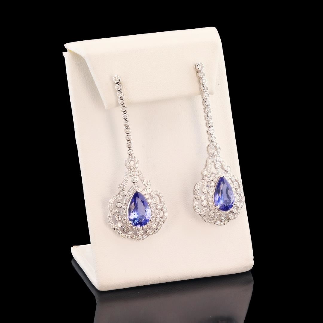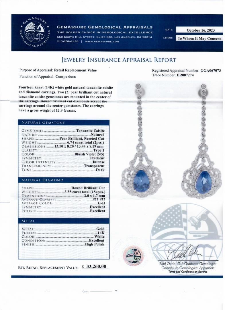 Fourteen karat (14K) white gold natural tanzanite zoisite and diamond earrings. Two (2) pear brilliant cut natural tanzanite zoisite gemstones are mounted in the center of the earrings. Round brilliant cut diamonds accent the earrings around the center gemstones. The earrings have a gross weight of 12.9 Grams. #NATURAL GEMSTONE# GEMSTONE: Tanzanite Zoisite NATURE: Natural SHAPE: Pear Brilliant, Faceted Cut WEIGHT: 6.74 carat total (2pcs.) DIMENSIONS: 13.50 x 8.20 / 13.44 x 8.19mm CLARITY: Type 1 Color: Bluish Violet (5/5) SYMMETRY: Excellent COLOR INTENSITY: Intense TRANSPARENCY: Transparent TONE: Dark #NATURAL DIAMOND# SHAPE: Round Brilliant Cut WEIGHT: 3.35 carat total (184pcs.) DIMENSIONS: 2.0 x 1.7mm AVERAGE CLARITY: SI1-SI2 AVERAGE COLOR: G-H SYMMETRY: Excellent POLISH: Excellent #METAL# METAL: Gold PURITY: 14K COLOR: White CONDITION: Excellent FINISH: High Polish #LREF-9448