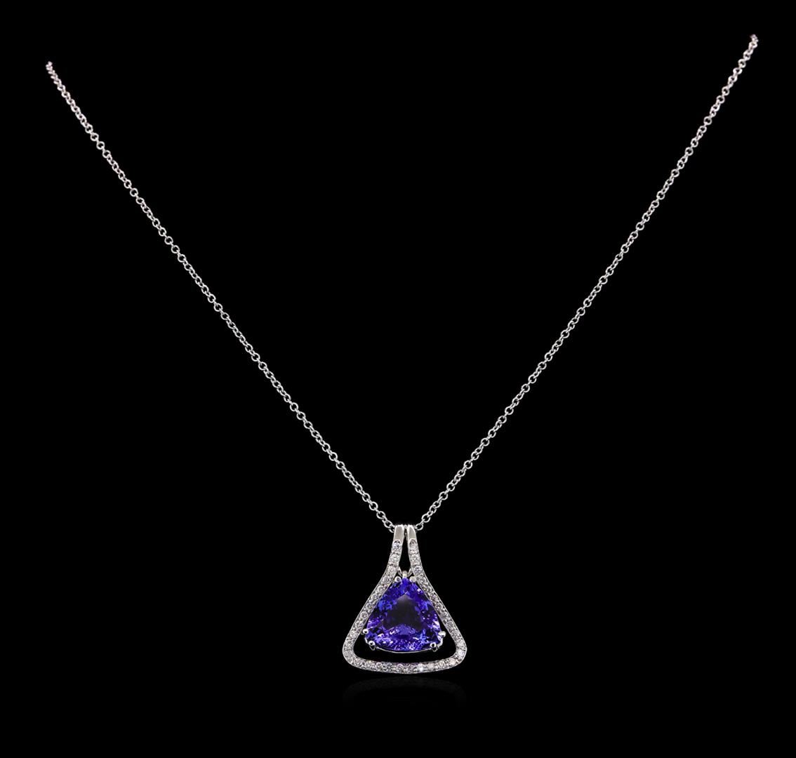 One electronically tested 14KT white gold lady's combination cast & assembled fashion pendant & chain 18.0" long, 1.5mm round cable link with a lobster claw clasp with a bright polish finish. Identified with markings of "14K". Condition is new, good workmanship. Containing: One prong set triangle modified brilliant cut natural tanzanite, measuring 12.80 x 12.53 x 6.57mm, 5%. bulge factor, approximate weight of 6.74ct., clarity is eye clean, type I, medium light, moderately strong, bluish violet color, (GIA bV 4/4), cut is very good. Transmitting light with no distortion, transparent. Colored gemstones are presumed to have been subjected to commonly used enhancement processes. Graded in the setting. Thirty-Four prong set round brilliant cut diamonds, measuring 1.50 - 1.40 x 0.90mm (depth est.) approximate total weight of 34 Stones = 0.40ct. Graded in the setting. Clarity: SI-1 to I-1. Color: G - H. Cut Good. Total Weight of Colored Stones 6.74ct. Total Weight of Diamonds 0.40ct. Total Weight of Pendant & Chain 7.40gm. GAS Appraised at $11,045.00.