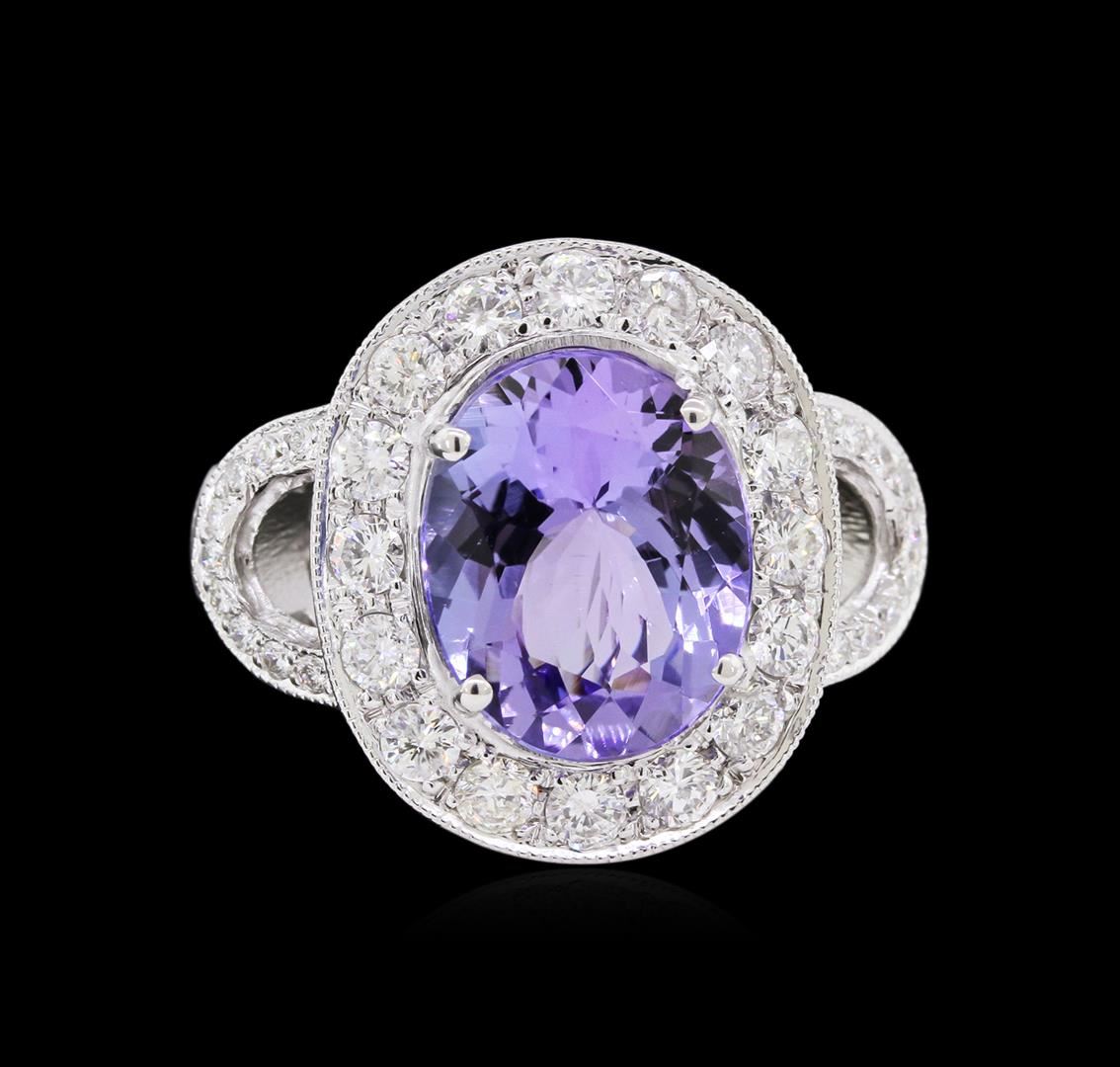 One electronically tested 18KT white gold lady's cast fashion ring with a European shank with a bright polish with milgrain detailing finish. The featured lady's ring has a halo and a hand engraved shank measuring 3.85 millimeters wide. Identified with markings of "18K". Condition is new, good workmanship. Containing: One prong set oval modified brilliant cut natural tanzanite, measuring 13.40 x 10.80 x 6.70mm, approximate weight of 6.74ct., clarity is eye clean, type I, medium light, slightly grayish, bluish violet color, (GIA bV 4/2), cut is good. Transmitting light with no distortion, transparent. Colored gemstones are presumed to have been subjected to commonly used enhancement processes. Graded in the setting. Sixteen bead set round brilliant cut diamonds, measuring 2.80 - 2.70 x 1.76mm (depth est.) approximate total weight of 16 Stones = 1.30ct. Graded in the setting. Clarity: SI-1 to I-1. Color: H - I. Cut Good Fifty-Eight bead set round brilliant cut diamonds, measuring 1.50 - 1.40 x 0.94mm (depth est.) approximate total weight of 58 Stones = 0.70ct. Graded in the setting. Clarity: SI-1 to SI-2. Color: H - I. Cut Good. Total Weight of Colored Stones 6.74ct. Total Weight of Diamonds 2.00ct. Total Weight of Ring 16.40gm. GAS Appraised at $12,165.00.