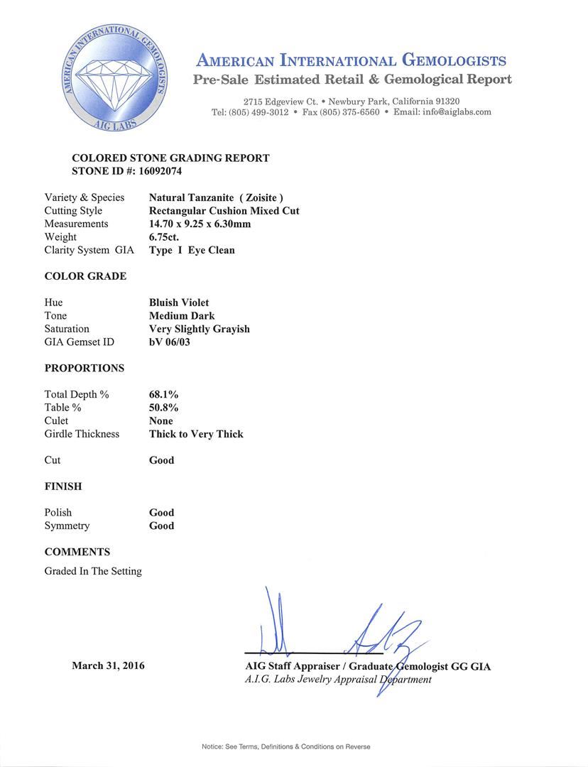 One electronically tested 14KT white gold ladies cast tanzanite and diamond ring. The featured tanzanite is set within a diamond bezel supported by an elaborate lattice under gallery and diamond set shoulders, completed by a two millimeter wide band. Bright polish finish with milgrain detailing. Identified with markings of "14K". Condition is new, good workmanship. Containing: One prong set rectangular cushion mixed cut natural tanzanite, measuring 14.70 x 9.25 x 6.30mm, approximate weight of 6.75ct., clarity is eye clean, type I, medium dark, very slightly grayish, bluish violet color, (GIA bV 6/3), cut is good. Transmitting light with no distortion, transparent. Colored Stone Grading Report attached. Graded in the setting. Tanzanite is a very rare gemstone that is only found in the country of Tanzania. Originally discovered in 1967. Tiffany & Company, named the stone Tanzanite. It is found in the Usumburu Mountains that border the Umba Valley of northern Tanzania. Tanzanite occurs in gray, brown, violet, blue, reddish-purple, & green. The gem is interesting because of its exceptional pleochroism. Rotated in different directions a tanzanite will exhibit multiple changes of color. Tanzanite has a low tolerance to ultrasonic cleaning, and should not be cleaned using this method. Thirty prong set round brilliant cut diamonds, measuring 1.50 - 1.50 x 0.90mm (depth est.) approximate total weight of 30 Stones = 0.37ct. Graded in the setting. Clarity: SI-2 to I-2. Color: G - I. Total Weight of Colored Stones 6.75ct. Total Weight of Diamonds 0.37ct. Total Weight of Ring 7.71gm. AIG Appraised at $16,670.00.