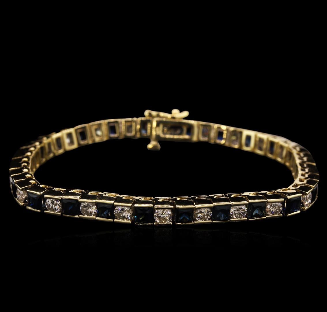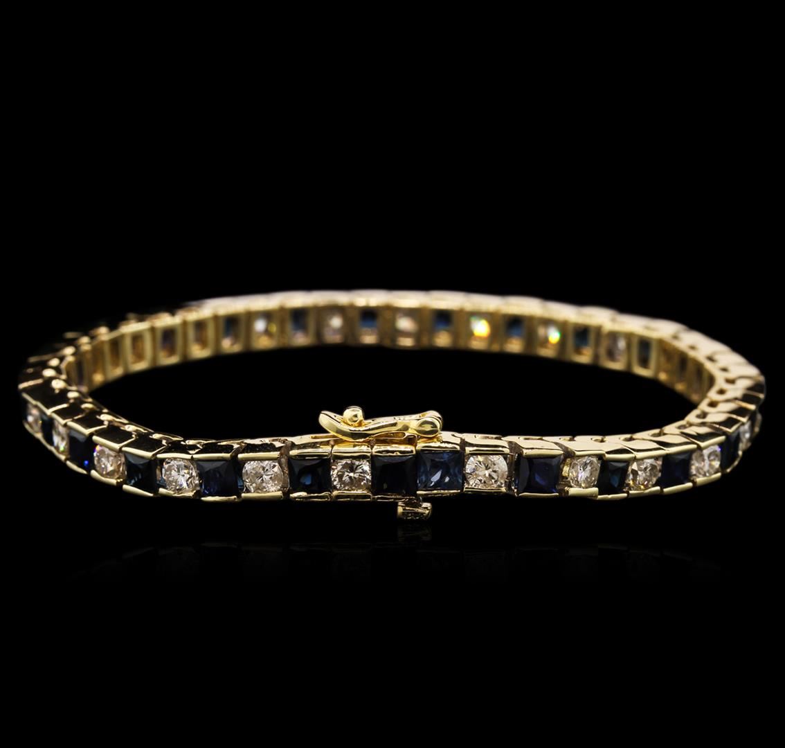 One electronically tested 14KT yellow gold lady's combination cast & assembled tennis bracelet with a tongue clasp with foldover safety with a bright polish finish. The featured lady's tennis bracelet measures approximately 7 inches in length. Identified with markings of "14K". Condition is new, good workmanship. Containing: Twenty-five channel set princess modified brilliant cut natural blue sapphires, measuring 3.50 x 3.40 x 2.30mm, approximate total weight of 6.75ct., clarity is slightly included, type II, medium dark, very slightly grayish, very slightly greenish blue color, (GIA vslgB 6/3), cut is good. Colored gemstones are presumed to have been subjected to commonly used enhancement processes. Graded in the setting. Twenty-Four channel set round brilliant cut diamonds, measuring 3.60 - 3.50 x 2.17mm (depth est.) approximate total weight of 24 Stones = 4.00ct. Graded in the setting. Clarity: SI-2 to I-1. Color: I - J. Cut Good. Total Weight of Colored Stones 6.75ct. Total Weight of Diamonds 4.00ct. Total Weight of Bracelet 25.00gm. GAS Appraised at $9,915.00.