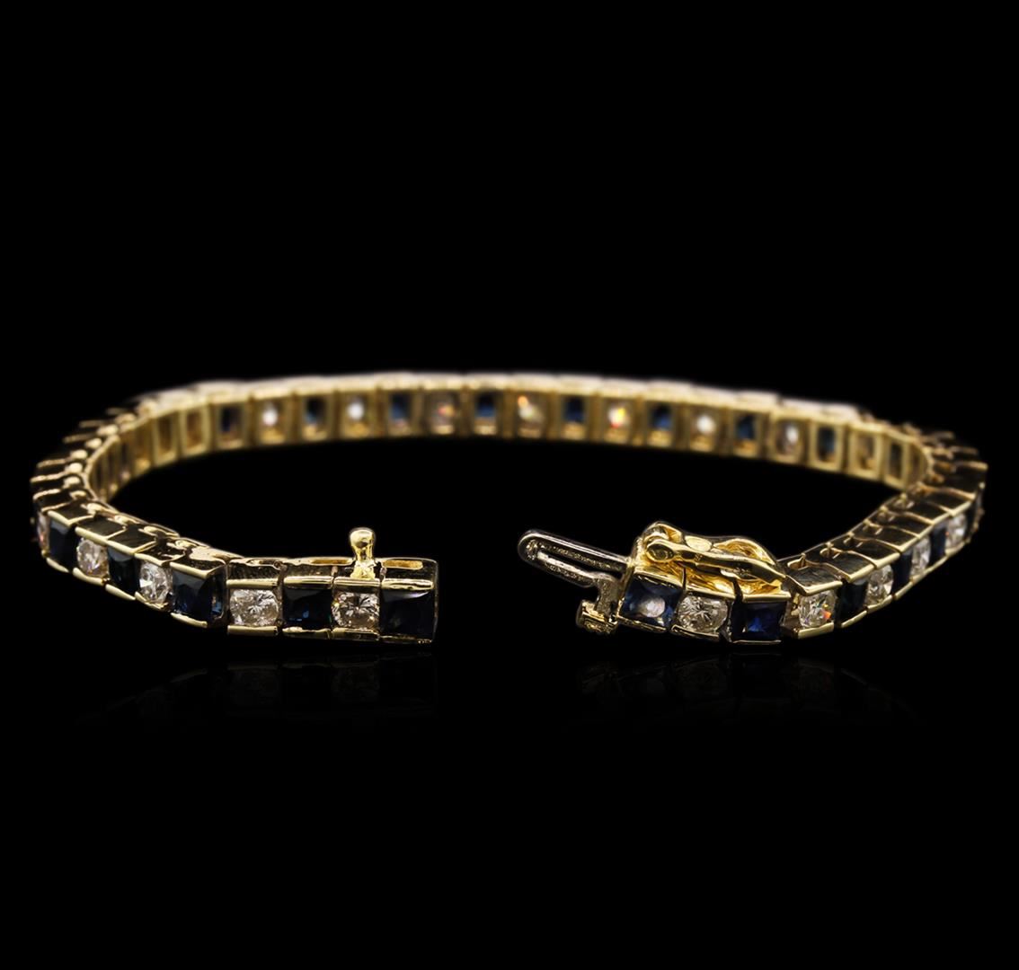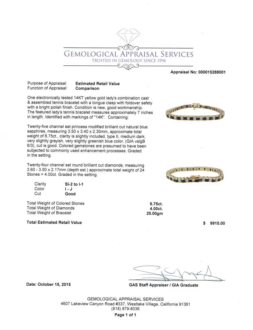 One electronically tested 14KT yellow gold lady's combination cast & assembled tennis bracelet with a tongue clasp with foldover safety with a bright polish finish. The featured lady's tennis bracelet measures approximately 7 inches in length. Identified with markings of "14K". Condition is new, good workmanship. Containing: Twenty-five channel set princess modified brilliant cut natural blue sapphires, measuring 3.50 x 3.40 x 2.30mm, approximate total weight of 6.75ct., clarity is slightly included, type II, medium dark, very slightly grayish, very slightly greenish blue color, (GIA vslgB 6/3), cut is good. Colored gemstones are presumed to have been subjected to commonly used enhancement processes. Graded in the setting. Twenty-Four channel set round brilliant cut diamonds, measuring 3.60 - 3.50 x 2.17mm (depth est.) approximate total weight of 24 Stones = 4.00ct. Graded in the setting. Clarity: SI-2 to I-1. Color: I - J. Cut Good. Total Weight of Colored Stones 6.75ct. Total Weight of Diamonds 4.00ct. Total Weight of Bracelet 25.00gm. GAS Appraised at $9,915.00.