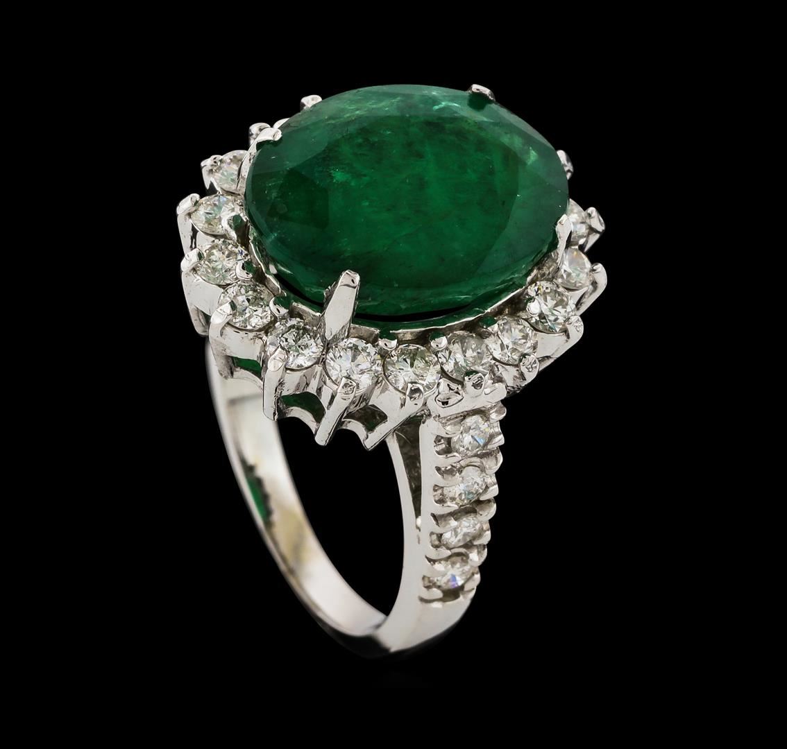 One electronically tested 14KT white gold lady's cast fashion ring with a cathedral shank with a basket halo with a bright polish finish. The featured lady's ring has a shank measuring 2.15 millimeters wide. Identified with markings of 'K14'. Condition is new, good workmanship. Containing: One prong set oval modified mixed cut natural emerald, measuring 14.05 x 10.90 x 6.45mm, (depth est.) 15%. bulge factor, approximate weight of 6.78ct., clarity is heavily included, medium dark, moderately strong, green color, (GIA G 6/4), cut is good. Transmitting light somewhat diffusely, semi-transparent to translucent. Naturally occurring internal & external characteristics are present. Indications of oil residue. Colored gemstones are presumed to have been subjected to commonly used enhancement processes. Graded in the setting. Eighteen prong set round brilliant cut diamonds, measuring 2.40 - 2.30 x 1.46mm (depth est.) approximate total weight of 18 Stones = 0.90ct. Graded in the setting. Clarity SI-1 to SI-2. Color: G - I Cut Good Eight prong set round brilliant cut diamonds, measuring 2.05 - 1.95 x 1.24mm (depth est.) approximate total weight of 8 Stones = 0.25ct. Graded in the setting. Clarity SI-1 to SI-2. Color: G - H Cut Good. Total Weight of Colored Stones 6.78ct.. Total Weight of Diamonds 1.15ct.. Total Weight of Ring 7.30gm. GAS Appraised at $9,400.00.