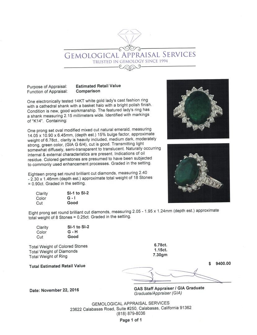 One electronically tested 14KT white gold lady's cast fashion ring with a cathedral shank with a basket halo with a bright polish finish. The featured lady's ring has a shank measuring 2.15 millimeters wide. Identified with markings of 'K14'. Condition is new, good workmanship. Containing: One prong set oval modified mixed cut natural emerald, measuring 14.05 x 10.90 x 6.45mm, (depth est.) 15%. bulge factor, approximate weight of 6.78ct., clarity is heavily included, medium dark, moderately strong, green color, (GIA G 6/4), cut is good. Transmitting light somewhat diffusely, semi-transparent to translucent. Naturally occurring internal & external characteristics are present. Indications of oil residue. Colored gemstones are presumed to have been subjected to commonly used enhancement processes. Graded in the setting. Eighteen prong set round brilliant cut diamonds, measuring 2.40 - 2.30 x 1.46mm (depth est.) approximate total weight of 18 Stones = 0.90ct. Graded in the setting. Clarity SI-1 to SI-2. Color: G - I Cut Good Eight prong set round brilliant cut diamonds, measuring 2.05 - 1.95 x 1.24mm (depth est.) approximate total weight of 8 Stones = 0.25ct. Graded in the setting. Clarity SI-1 to SI-2. Color: G - H Cut Good. Total Weight of Colored Stones 6.78ct.. Total Weight of Diamonds 1.15ct.. Total Weight of Ring 7.30gm. GAS Appraised at $9,400.00.