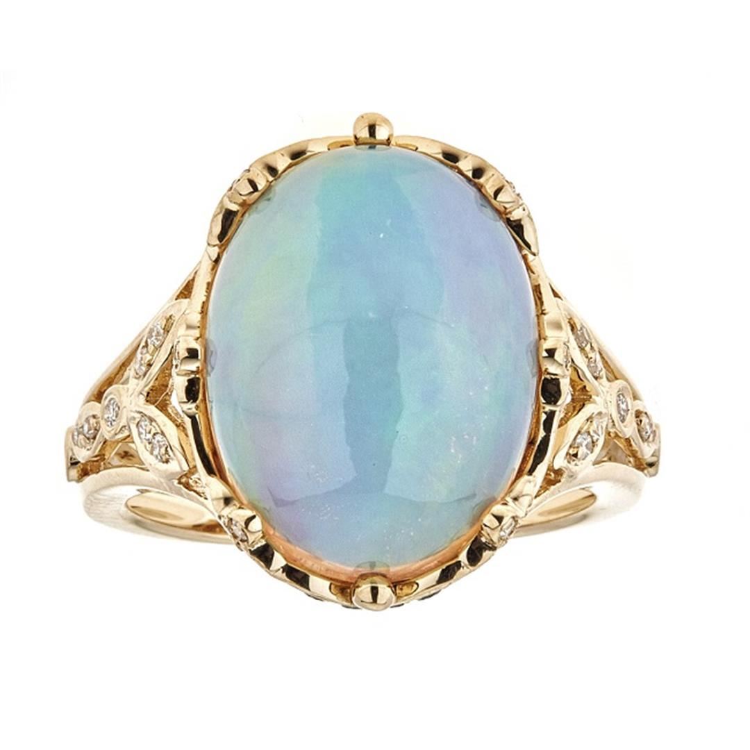 One Ethiopian Opal, Blue Sapphire, and Diamond Ring featuring: 14KT Yellow Gold with a total weight of 5.52 grams, Ethiopian Opal with a total weight of 6.78ct, 16 Blue Sapphires with a total weight of 0.21ctw, and 34 Diamonds with a total weight of 0.16ctw.