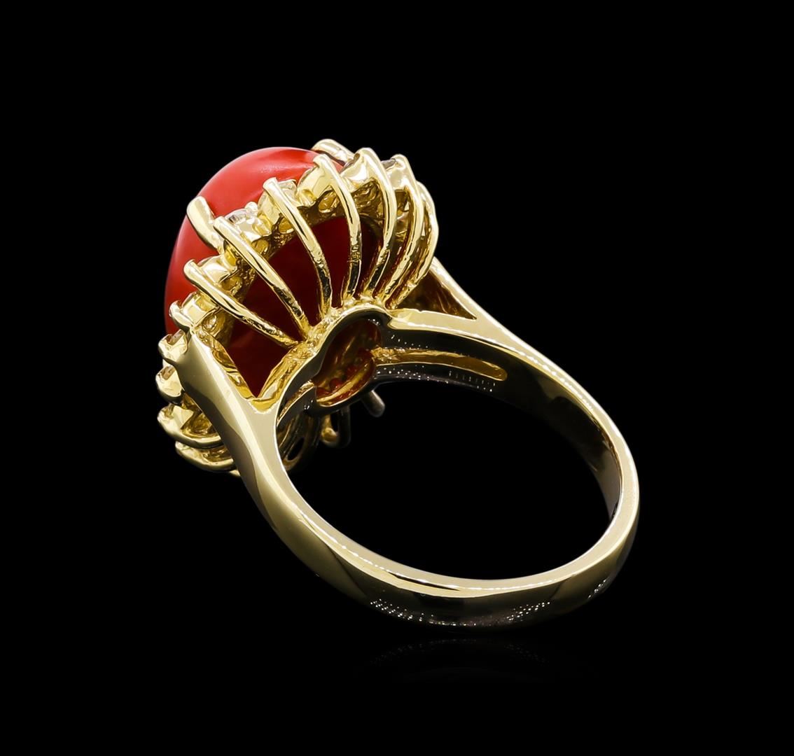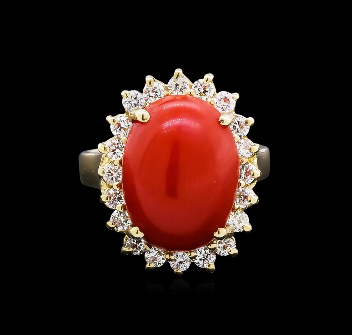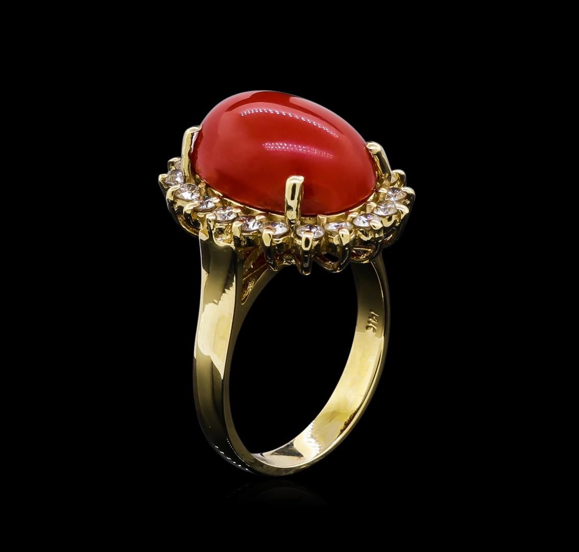 One ring featuring: 14KT yellow gold weighing 5.52 grams containing one coral with a total weight of 6.80ct and diamonds with a total weight of 0.65ct.