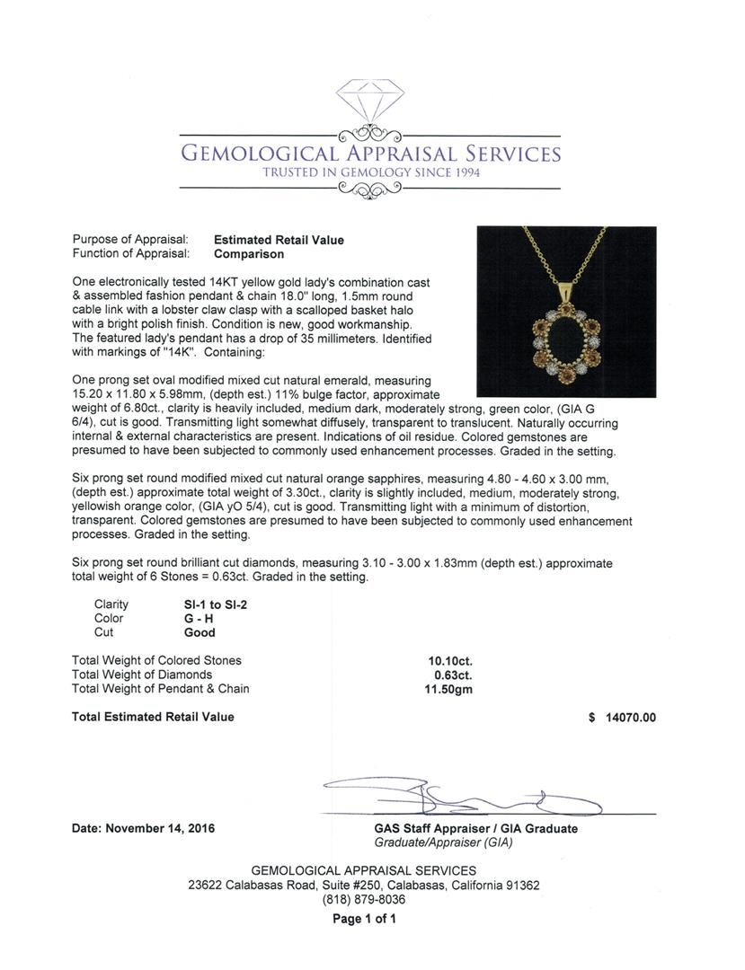 One electronically tested 14KT yellow gold lady's combination cast & assembled fashion pendant & chain 18.0' long, 1.5mm round cable link with a lobster claw clasp with a scalloped basket halo with a bright polish finish. The featured lady's pendant has a drop of 35 millimeters. Identified with markings of '14K'. Condition is new, good workmanship. Containing: One prong set oval modified mixed cut natural emerald, measuring 15.20 x 11.80 x 5.98mm, (depth est.) 11%. bulge factor, approximate weight of 6.80ct., clarity is heavily included, medium dark, moderately strong, green color, (GIA G 6/4), cut is good. Transmitting light somewhat diffusely, transparent to translucent. Naturally occurring internal & external characteristics are present. Indications of oil residue. Colored gemstones are presumed to have been subjected to commonly used enhancement processes. Graded in the setting. Six prong set round modified mixed cut natural orange sapphires, measuring 4.80 - 4.60 x 3.00 mm, (depth est.) approximate total weight of 3.30ct., clarity is slightly included, medium, moderately strong, yellowish orange color, (GIA yO 5/4), cut is good. Transmitting light with a minimum of distortion, transparent. Colored gemstones are presumed to have been subjected to commonly used enhancement processes. Graded in the setting. Six prong set round brilliant cut diamonds, measuring 3.10 - 3.00 x 1.83mm (depth est.) approximate total weight of 6 Stones = 0.63ct. Graded in the setting. Clarity SI-1 to SI-2. Color: G - H Cut Good. Total Weight of Colored Stones 10.10ct.. Total Weight of Diamonds 0.63ct.. Total Weight of Pendant & Chain 11.50gm GAS Appraised at $14,070.00.