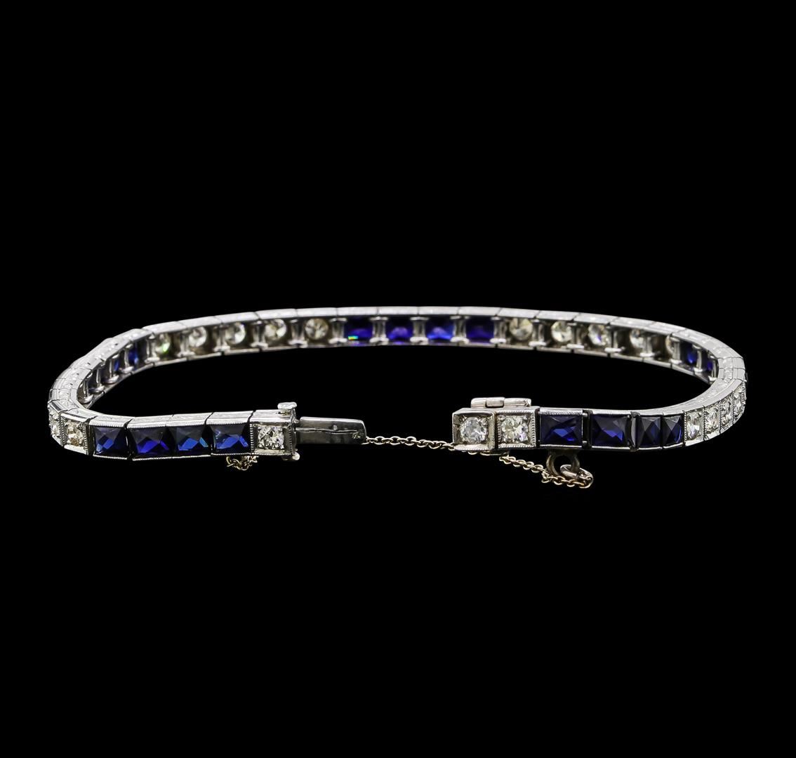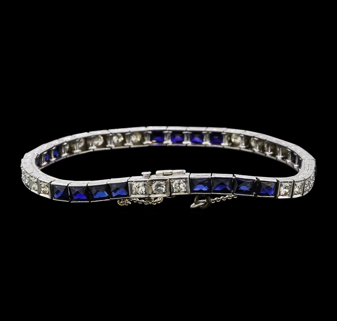 One electronically tested platinum ladies cast & assembled lab created sapphire and diamond bracelet. Seven and one quarter inch length bracelet features a flexible ribbon of lab created sapphires and diamonds, terminating in a concealed clasp with a snap locking safety and three inch safety chain. Bright and patterned finish with milgrain detailing. Condition is good. Containing: Twenty channel set rectangular mixed cut laboratory created blue sapphires, measuring 4.00 x 3.30 x 2.15mm, approximate total weight of 6.80ct., clarity is eye clean, type II, dark, moderately strong, blue color, (GIA B 7/4), cut is good. Transmitting light with no distortion, transparent. Measurements & the color grade are an average for the group. Graded in the setting. Twenty-Three prong set transitional cut diamonds, measuring 2.00 - 2.00 x 1.24mm (depth est.) approximate total weight of 23 Stones = 0.70ct. Graded in the setting. Clarity VS-1 to SI-2. Color: G - I. Total Weight of Colored Stones 6.80ct.. Total Weight of Diamonds 0.70ct.. Total Weight of Bracelet 17.43gm. AIG Appraised at $5,495.00.