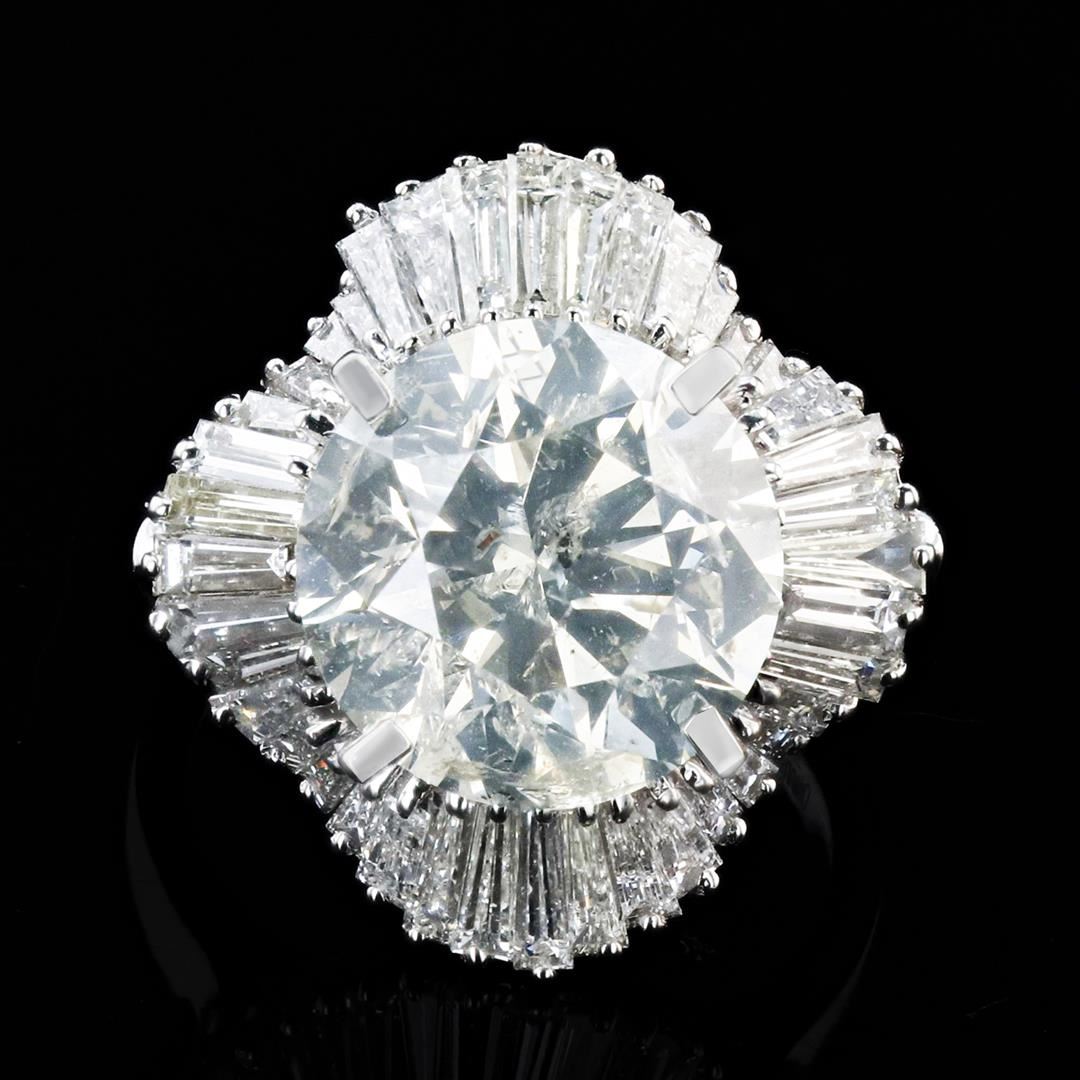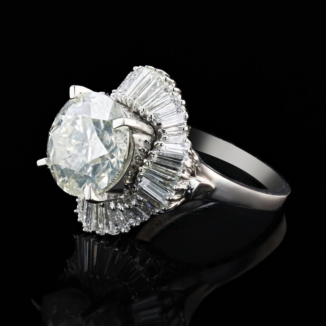 6.81ct CENTER Diamond Platinum Ring (9.48ctw Diamonds). One polished, stamped, and tested platinum ring with a bright finish. The ring is mounted with 1 genuine diamond center stone weighing approximately 6.81 carat, and 40 genuine baguette diamonds weighing approximately 2.67 carats. This item weighs 16.9 grams, condi-tion is new, very good workmanship. MAIN GEMSTONE Identity: Natural Diamond Shape: Round Cutting Style: Brilliant Cut Average Diameter: 11.9mm Weight: 6.81 carat Color Grade: I Clarity Grade: I1 Cut Grade: Very Good Refractive Index: 2.417 Hardness: 10 ADJACENT GEMSTONES ON RING Identity: Natural Diamond Shape: Tapered Baguette Cutting Style: Step Cut Quantity: 40 Diamonds Measurements: 2.5 - 4.5mm Total Weight: 2.67 carats Color Grade: G - H Clarity Grade: VS2 - SI2 Refractive Index: 2.418 Hardness: 10 CENTER DIAMOND WEIGHT: 6.81 ct TOTAL DIAMOND WEIGHT: 9.48 cts WEIGHT OF ITEM: 16.9 grams METAL: Platinum