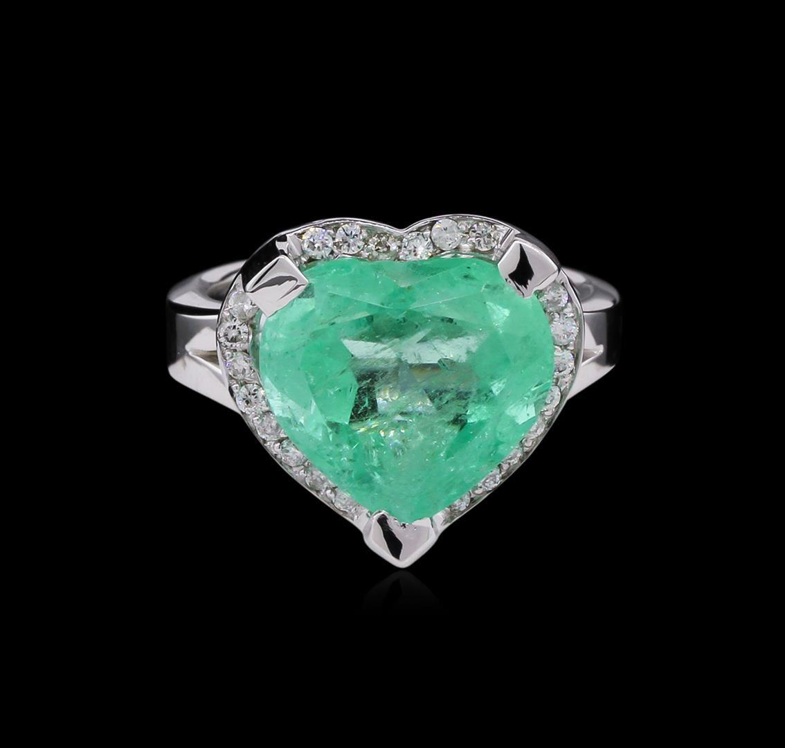 One electronically tested 14KT white gold lady's cast fashion ring with a bright polish finish. The featured lady's ring has a shank measuring 2.85 millimeters in width. Identified with markings of "14K". Condition is new, good workmanship. Containing: One prong set heart modified brilliant cut natural emerald, measuring 11.85 x 12.58 x 8.40mm, approximate weight of 6.81ct., clarity is heavily included, type III, medium light, very slightly grayish, very slightly bluish green color, (GIA vslbG 4/3), cut is good. Naturally occurring internal & external characteristics are present. Indications of oil residue. Colored gemstones are presumed to have been subjected to commonly used enhancement processes. Graded in the setting. Twenty-Two prong set round brilliant cut diamonds, measuring 1.40 - 1.35 x 0.86mm (depth est.) approximate total weight of 22 Stones = 0.22ct. Graded in the setting. Clarity: SI-1 to I-1 . Color: H - I. Cut Good. Total Weight of Colored Stones 6.81ct.. Total Weight of Diamonds 0.22ct.. Total Weight of Ring 8.60gm at $ 12440.00 GAS Appraised.
