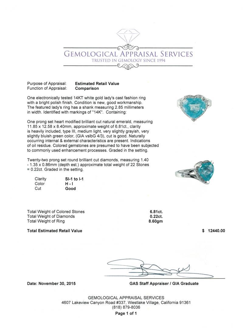 One electronically tested 14KT white gold lady's cast fashion ring with a bright polish finish. The featured lady's ring has a shank measuring 2.85 millimeters in width. Identified with markings of "14K". Condition is new, good workmanship. Containing: One prong set heart modified brilliant cut natural emerald, measuring 11.85 x 12.58 x 8.40mm, approximate weight of 6.81ct., clarity is heavily included, type III, medium light, very slightly grayish, very slightly bluish green color, (GIA vslbG 4/3), cut is good. Naturally occurring internal & external characteristics are present. Indications of oil residue. Colored gemstones are presumed to have been subjected to commonly used enhancement processes. Graded in the setting. Twenty-Two prong set round brilliant cut diamonds, measuring 1.40 - 1.35 x 0.86mm (depth est.) approximate total weight of 22 Stones = 0.22ct. Graded in the setting. Clarity: SI-1 to I-1 . Color: H - I. Cut Good. Total Weight of Colored Stones 6.81ct.. Total Weight of Diamonds 0.22ct.. Total Weight of Ring 8.60gm at $ 12440.00 GAS Appraised.