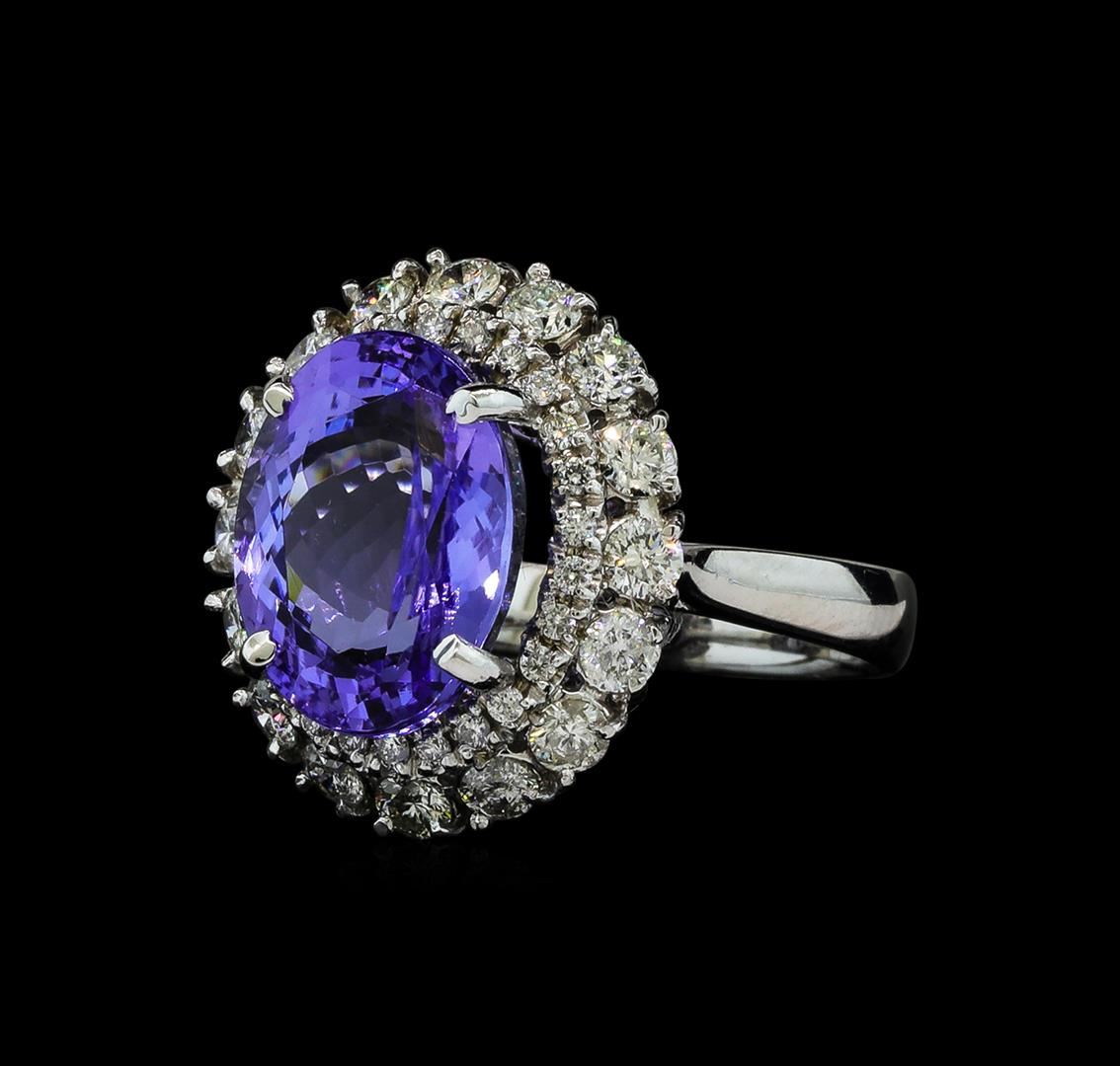 One electronically tested 14KT white gold lady's cast fashion ring with a tapered shank double basket halo with a bright polish finish. The featured lady's ring has a shank measuring 3.15 millimeters wide. Identified with markings of 'K14'. Condition is new, good workmanship. Containing: One prong set oval modified brilliant cut natural tanzanite, measuring 13.00 x 9.88 x 6.64mm, (depth est.) 13%. bulge factor, approximate weight of 6.82ct., clarity is eye clean, medium light, very slightly grayish, violetish blue color, (GIA vB 4/3), cut is very good. Transmitting light with no distortion, transparent. Colored gemstones are presumed to have been subjected to commonly used enhancement processes. Graded in the setting. Sixteen prong set round brilliant cut diamonds, measuring 2.60 - 2.55 x 1.60mm (depth est.) approximate total weight of 16 Stones = 1.05ct. Graded in the setting. Clarity SI-1 to I-1. Color: H - I Cut Good Twenty-Six prong set round brilliant cut diamonds, measuring 1.30 - 1.20 x 0.78mm (depth est.) approximate total weight of 26 Stones = 0.20ct. Graded in the setting. Clarity SI-1 to I-1. Color: H - I Cut Good. Total Weight of Colored Stones 6.82ct.. Total Weight of Diamonds 1.25ct.. Total Weight of Ring 6.80gm GAS Appraised at $11,605.00.