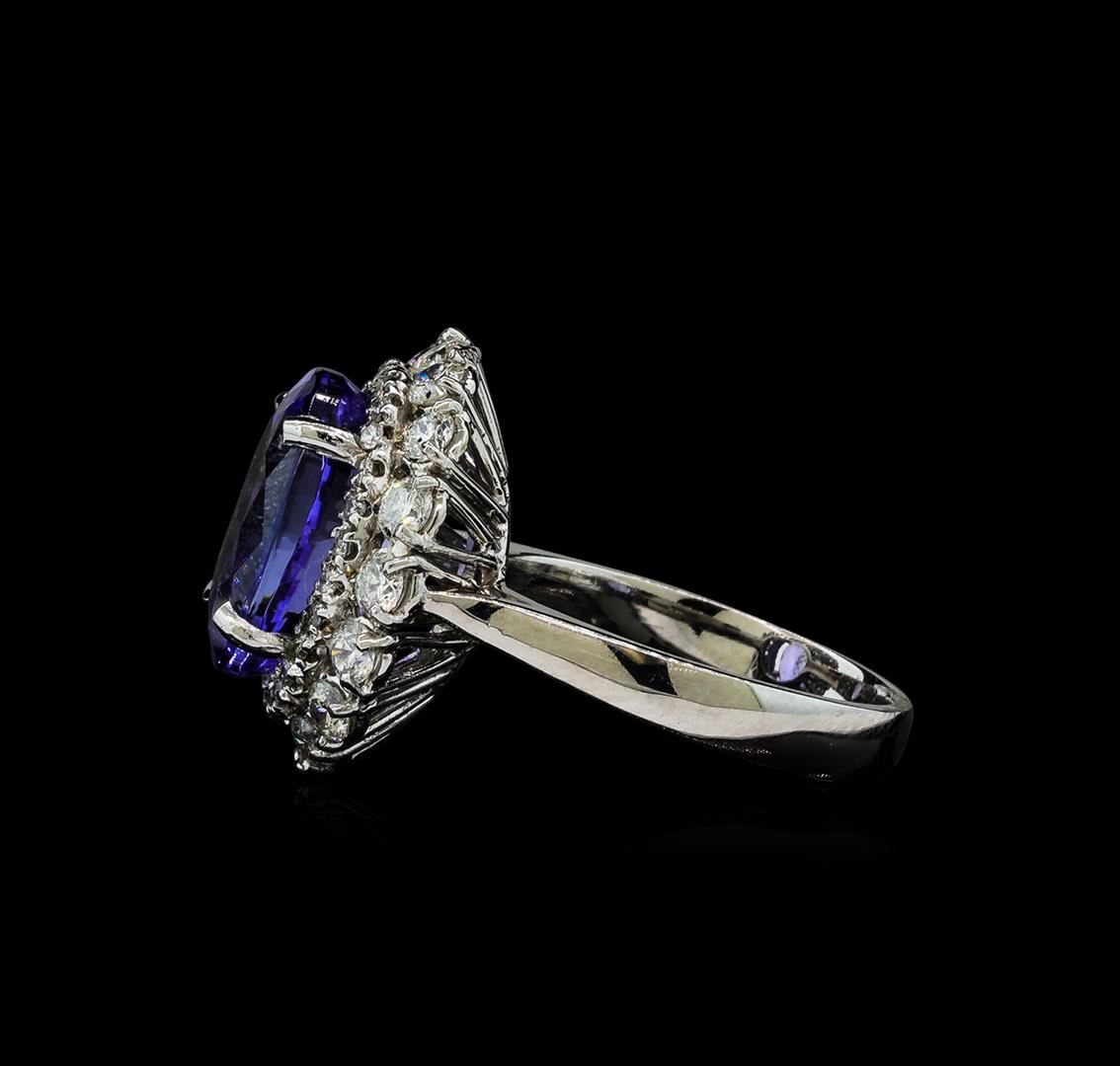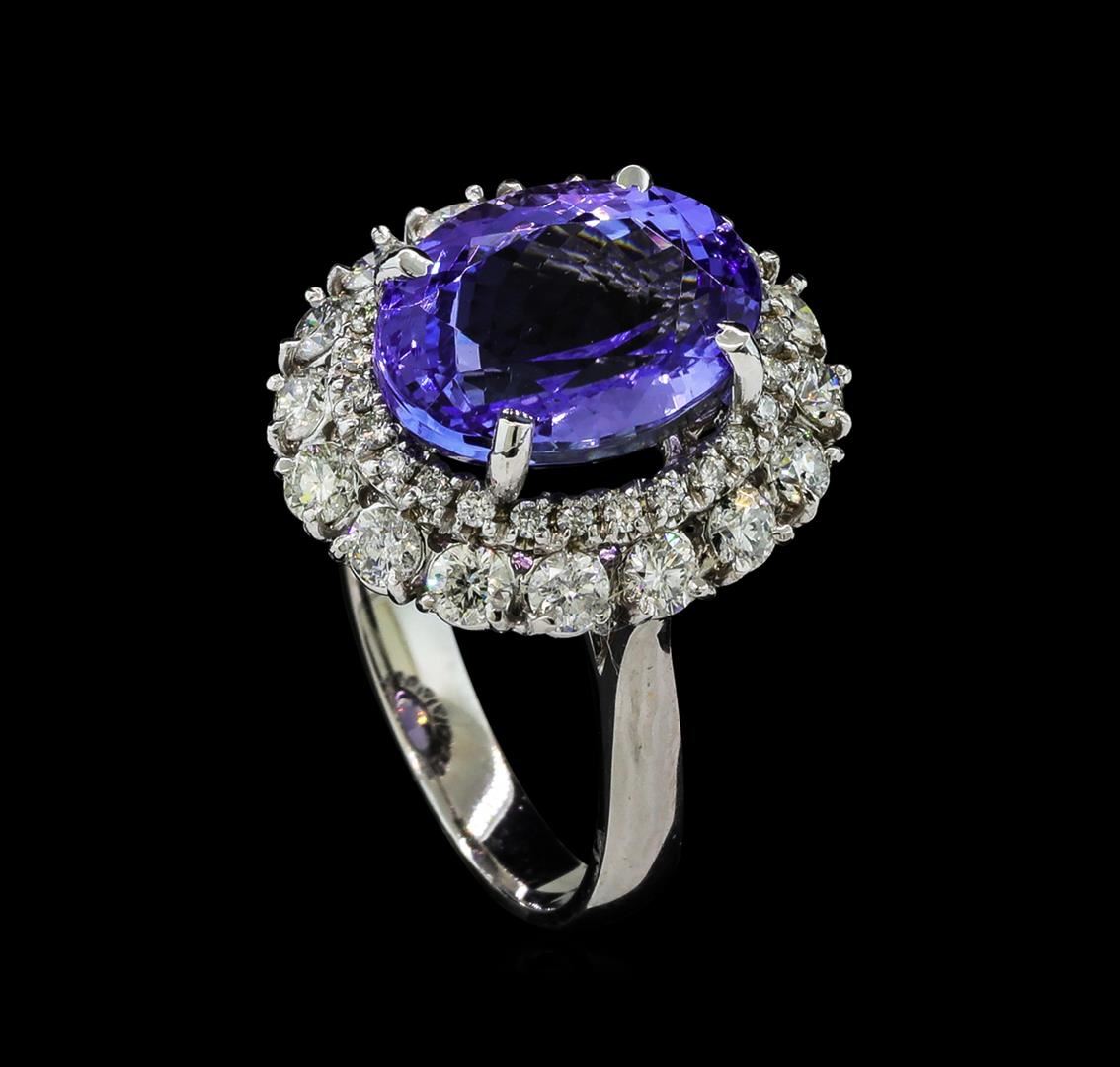 One electronically tested 14KT white gold lady's cast fashion ring with a tapered shank double basket halo with a bright polish finish. The featured lady's ring has a shank measuring 3.15 millimeters wide. Identified with markings of 'K14'. Condition is new, good workmanship. Containing: One prong set oval modified brilliant cut natural tanzanite, measuring 13.00 x 9.88 x 6.64mm, (depth est.) 13%. bulge factor, approximate weight of 6.82ct., clarity is eye clean, medium light, very slightly grayish, violetish blue color, (GIA vB 4/3), cut is very good. Transmitting light with no distortion, transparent. Colored gemstones are presumed to have been subjected to commonly used enhancement processes. Graded in the setting. Sixteen prong set round brilliant cut diamonds, measuring 2.60 - 2.55 x 1.60mm (depth est.) approximate total weight of 16 Stones = 1.05ct. Graded in the setting. Clarity SI-1 to I-1. Color: H - I Cut Good Twenty-Six prong set round brilliant cut diamonds, measuring 1.30 - 1.20 x 0.78mm (depth est.) approximate total weight of 26 Stones = 0.20ct. Graded in the setting. Clarity SI-1 to I-1. Color: H - I Cut Good. Total Weight of Colored Stones 6.82ct.. Total Weight of Diamonds 1.25ct.. Total Weight of Ring 6.80gm GAS Appraised at $11,605.00.