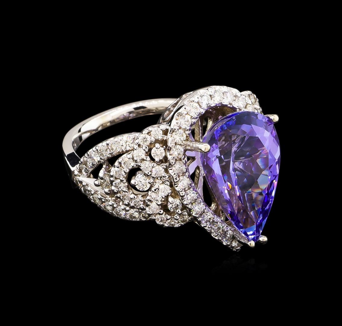 One electronically tested 14KT white gold lady's cast fashion ring with a crossover split shank with a bright polish finish. The featured lady's ring has a double shank measuring 5.85 millimeters wide. Identified with markings of "K14". Condition is new, good workmanship. Containing: One prong set pear modified brilliant cut natural tanzanite, measuring 15.05 x 10.45 x 6.79mm, approximate weight of 6.82ct., clarity is eye clean, type I, medium, moderately strong, bluish violet color, (GIA bV 5/4), cut is very good. Transmitting light with no distortion, transparent. Colored gemstones are presumed to have been subjected to commonly used enhancement processes. Graded in the setting. Four prong set round brilliant cut diamonds, measuring 2.00 - 1.80 x 1.18mm (depth est.) approximate total weight of 4 Stones = 0.12ct. Graded in the setting. Clarity: SI-1 to I-1. Color: H - I. Cut Good Eighty-Nine round brilliant cut diamonds, measuring 1.55 - 1.40 x 0.92mm (depth est.) approximate total weight of 89 Stones = 1.12ct. Graded in the setting. Total Weight of Colored Stones 6.82ct. Total Weight of Diamonds 1.24ct. Total Weight of Ring 10.30gm. GAS Appraised at $14,155.00.