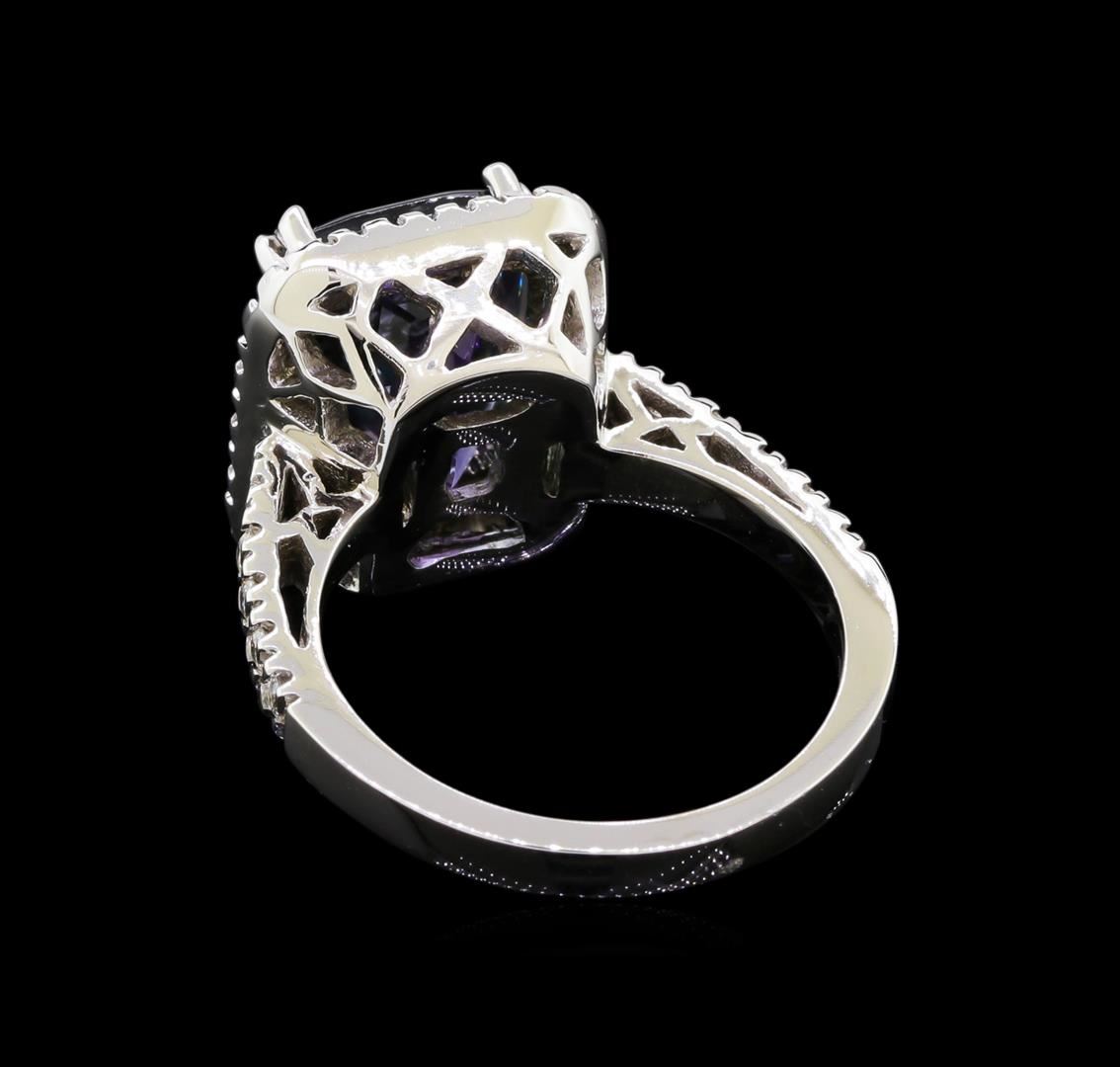 One electronically tested 14KT white gold lady's cast fashion ring with a basket halo with a bright polish finish. The featured lady's ring has a shank measuring 2.27 millimeters wide. Identified with markings of "14K". Condition is new, good workmanship. Containing: One prong set rectangular cushion modified brilliant cut natural tanzanite, measuring 11.43 x 9.78 x 7.62mm, approximate weight of 6.83ct., clarity is eye clean, type I, medium dark, very slightly grayish, violetish blue color, (GIA vB 6/3), cut is very good. Transmitting light with no distortion, transparent. Colored gemstones are presumed to have been subjected to commonly used enhancement processes. Graded in the setting. Thirty prong set round brilliant cut diamonds, measuring 1.60 - 1.50 x 0.96mm (depth est.) approximate total weight of 30 Stones = 0.42ct. Graded in the setting. Clarity: SI-1 to SI-2. Color: H - I. Cut Good. Total Weight of Colored Stones 6.83ct. Total Weight of Diamonds 0.42ct. Total Weight of Ring 8.20gm. GAS Appraised at $13,365.00.