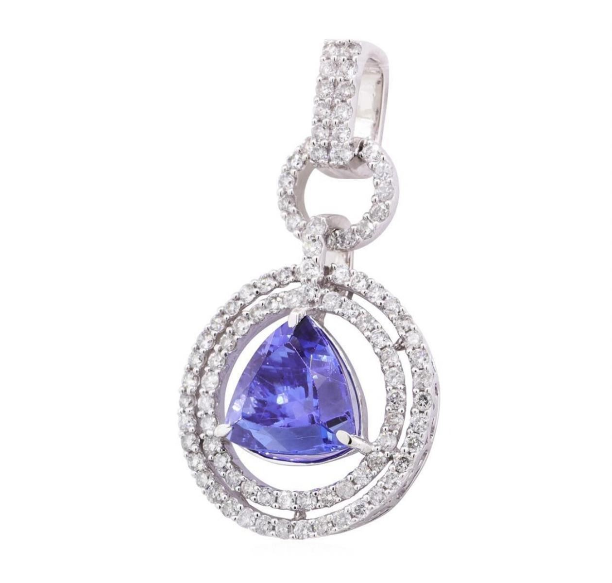 One electronically tested 14KT white gold lady's combination cast & assembled fashion pendant with a double halo with a bright polish finish. The featured lady's pendant has a double circular drop motif measuring approximately thiry nine millimeters in length. Trademark is Orianne. Identified with markings of '14K'. Condition is new, good workmanship. Containing: One prong set triangle modified brilliant cut natural tanzanite, measuring 11.00 x 10.60 x 8.10mm, (depth est.) approximate weight of 5.40ct., clarity is eye clean, medium, very slightly grayish, violetish blue color, (GIA vB 5/3), cut is very good. Transmitting light with no distortion, transparent. Colored gemstones are presumed to have been subjected to commonly used enhancement processes. Graded in the setting. Ninety-Eight prong set round brilliant cut diamonds, measuring 1.60 - 1.55 x 0.98mm (depth est.) approximate total weight of 98 Stones = 1.45ct. Graded in the setting. Color H - I Clarity SI-2 to I-1 Cut Good. Total Weight of Colored Stones 5.40ct.. Total Weight of Diamonds 1.45ct.. Total Weight of Pendant 7.30gm GAS Appraised at $9090.00. GAS Appraised.