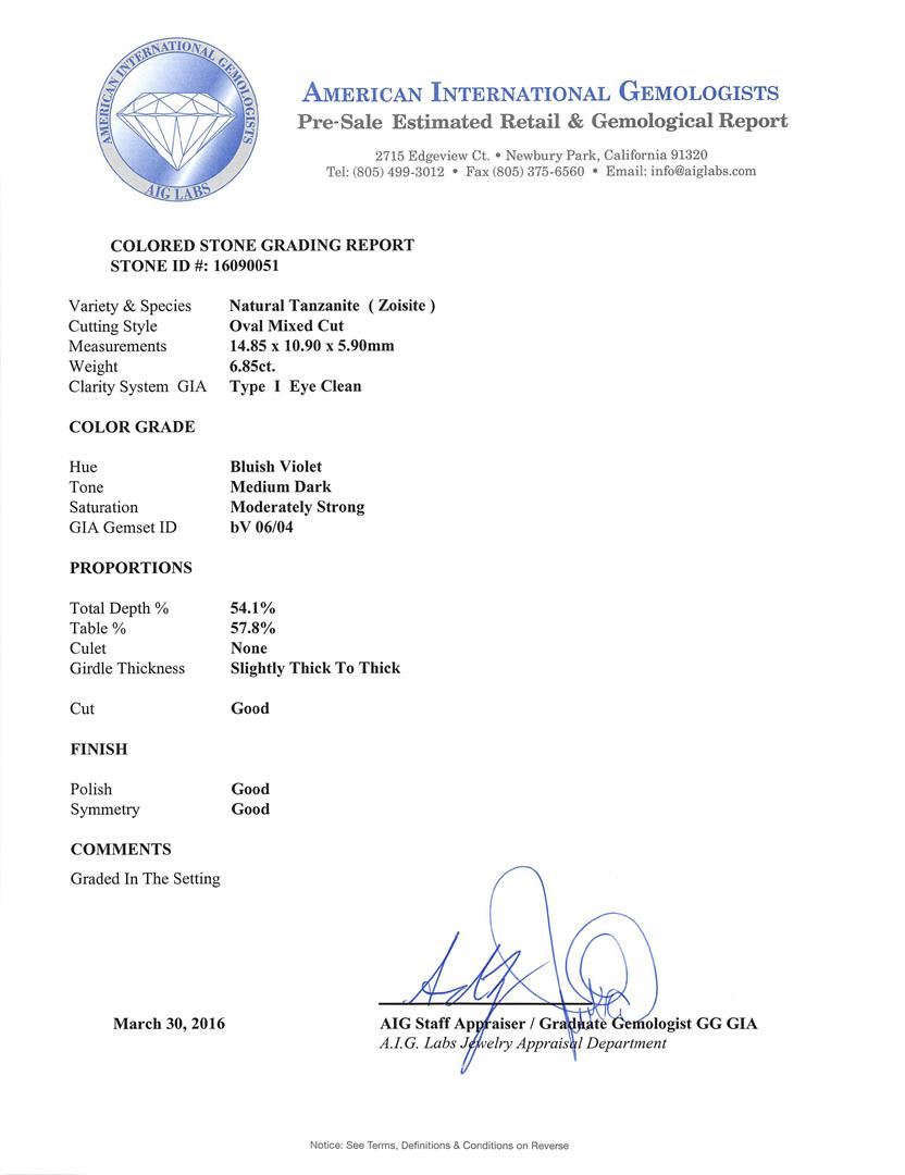 One electronically tested 14KT white gold ladies cast tanzanite and diamond ring with a bright polish finish. The featured tanzanite is set within a diamond floret supported by a ribbed under gallery, completed by a two and one-half millimeter wide band. Identified with markings of "14K". Condition is new, good workmanship. Containing: One prong set oval mixed cut natural tanzanite, measuring 14.85 x 10.90 x 5.90mm, 2%. bulge factor, approximate weight of 6.85ct., clarity is eye clean, type I, medium dark, moderately strong, bluish violet color, (GIA bV 6/4), cut is good. Transmitting light with no distortion, transparent. Colored Stone Grading Report attached. Graded in the setting. Tanzanite is a very rare gemstone that is only found in the country of Tanzania. Originally discovered in 1967. Tiffany & Company, named the stone Tanzanite. It is found in the Usumburu Mountains that border the Umba Valley of northern Tanzania. Tanzanite occurs in gray, brown, violet, blue, reddish-purple, & green. The gem is interesting because of its exceptional pleochroism. Rotated in different directions a tanzanite will exhibit multiple changes of color. Tanzanite has a low tolerance to ultrasonic cleaning, and should not be cleaned using this method. Twenty-Two prong set round brilliant cut diamonds, measuring 1.80 - 1.70 x 1.05mm (depth est.) approximate. Total Weight of 22 Stones = 0.43ct. Graded in the setting. Clarity: SI-2 to I-1. Color: F - H. Total Weight of Colored Stones 6.85ct. Total Weight of Diamonds 0.43ct. Total Weight of Ring 7.65gm. AIG Appraised at $17,830.00.