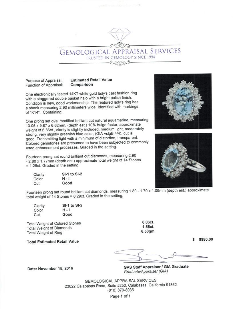 One electronically tested 14KT white gold lady's cast fashion ring with a staggered double basket halo with a bright polish finish. The featured lady's ring has a shank measuring 2.90 millimeters wide. Identified with markings of 'K14'. Condition is new, good workmanship. Containing: One prong set oval modified brilliant cut natural aquamarine, measuring 13.05 x 9.87 x 6.62mm, (depth est.) 10%. bulge factor, approximate weight of 6.86ct., clarity is slightly included, medium light, moderately strong, very slightly greenish blue color, (GIA vslgB 4/4), cut is good. Transmitting light with a minimum of distortion, transparent. Colored gemstones are presumed to have been subjected to commonly used enhancement processes. Graded in the setting. Fourteen prong set round brilliant cut diamonds, measuring 2.90 - 2.80 x 1.77mm (depth est.) approximate total weight of 14 Stones = 1.26ct. Graded in the setting. Clarity SI-1 to SI-2. Color: H - I Cut Good Fourteen prong set round brilliant cut diamonds, measuring 1.80 - 1.70 x 1.09mm (depth est.) approximate total weight of 14 Stones = 0.29ct. Graded in the setting. Clarity SI-1 to SI-2. Color: H - I Cut Good. Total Weight of Colored Stones 6.86ct.. Total Weight of Diamonds 1.55ct.. Total Weight of Ring 6.50gm. GAS Appraised at $9,980.00.