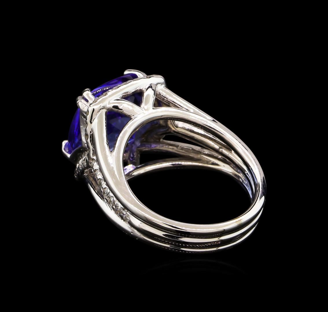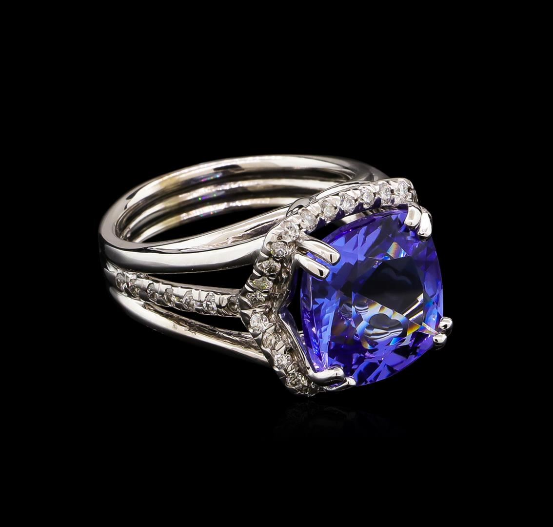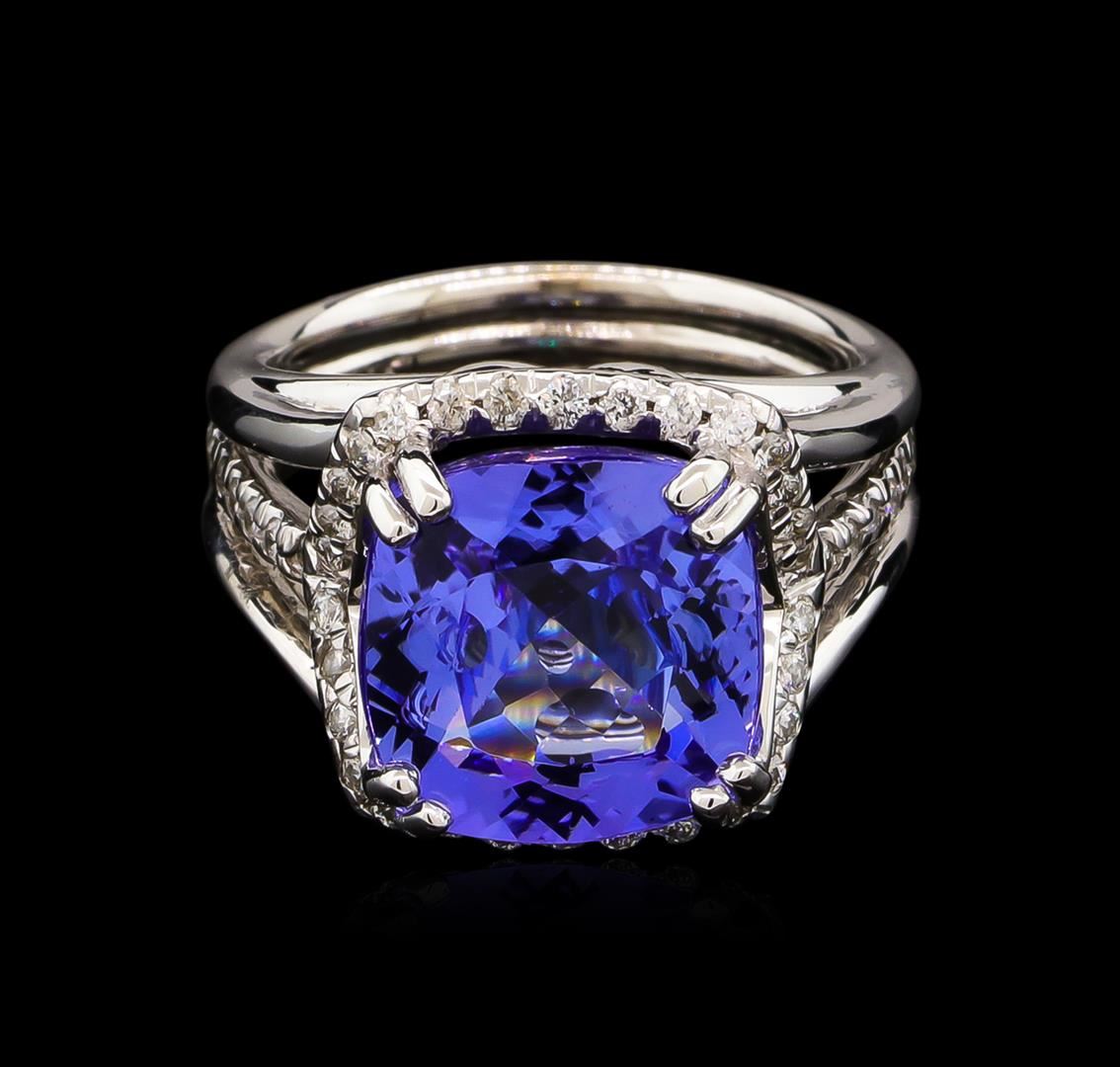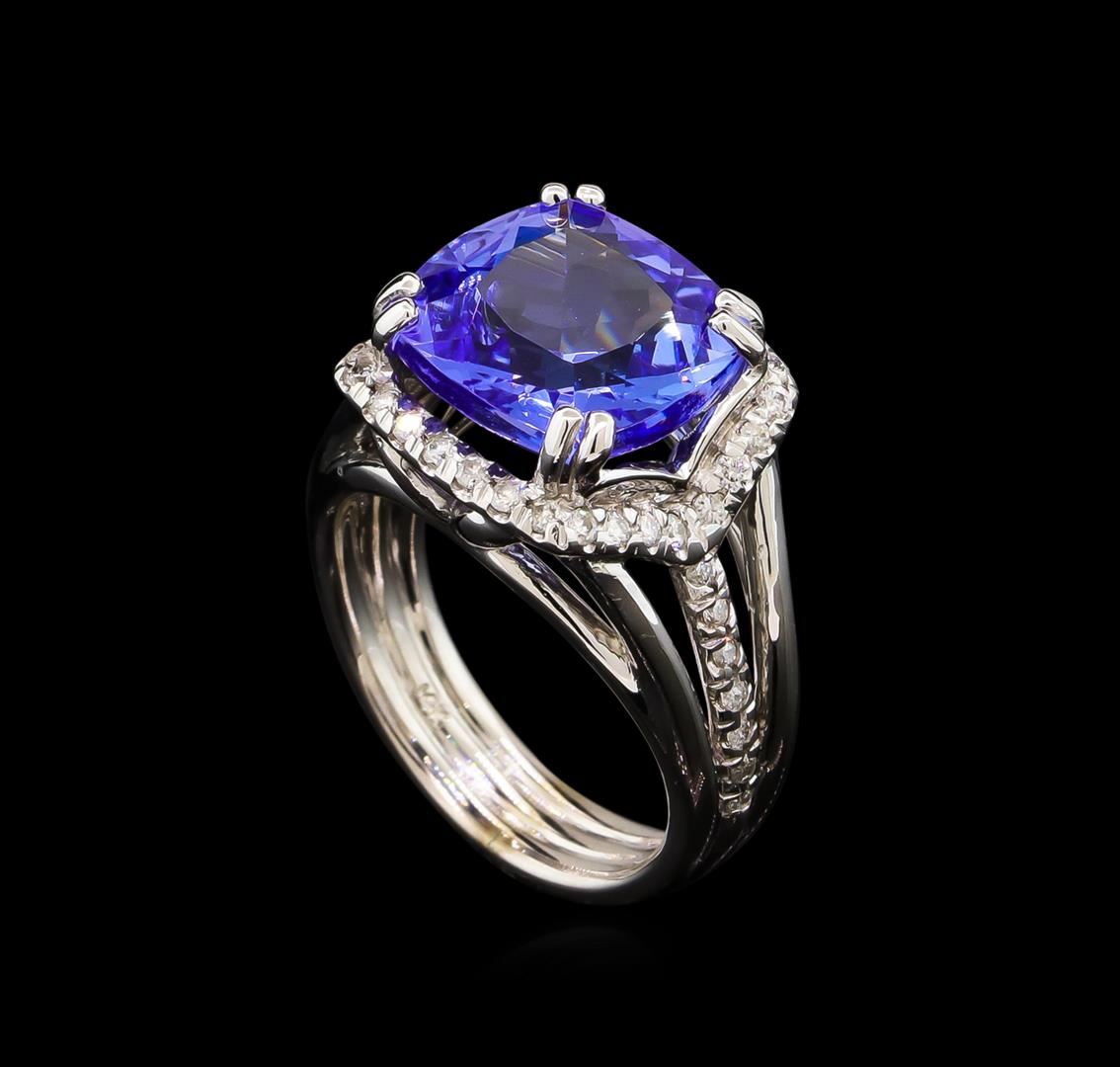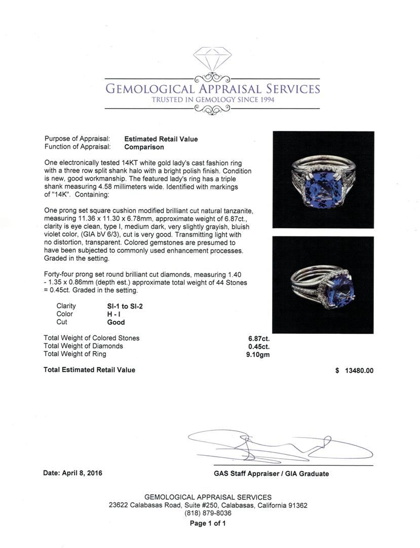 One electronically tested 14KT white gold lady's cast fashion ring with a three row split shank halo with a bright polish finish. The featured lady's ring has a triple shank measuring 4.58 millimeters wide. Identified with markings of "14K". Condition is new, good workmanship. Containing: One prong set square cushion modified brilliant cut natural tanzanite, measuring 11.36 x 11.30 x 6.78mm, approximate weight of 6.87ct., clarity is eye clean, type I, medium dark, very slightly grayish, bluish violet color, (GIA bV 6/3), cut is very good. Transmitting light with no distortion, transparent. Colored gemstones are presumed to have been subjected to commonly used enhancement processes. Graded in the setting. Forty-Four prong set round brilliant cut diamonds, measuring 1.40 - 1.35 x 0.86mm (depth est.) approximate total weight of 44 Stones = 0.45ct. Graded in the setting. Clarity: SI-1 to SI-2. Color: H - I. Cut Good. Total Weight of Colored Stones 6.87ct. Total Weight of Diamonds 0.45ct. Total Weight of Ring 9.10gm. GAS Appraised at $13,480.00.
