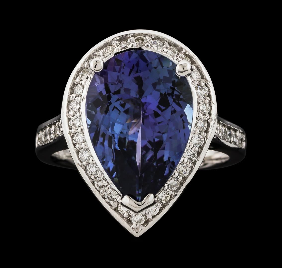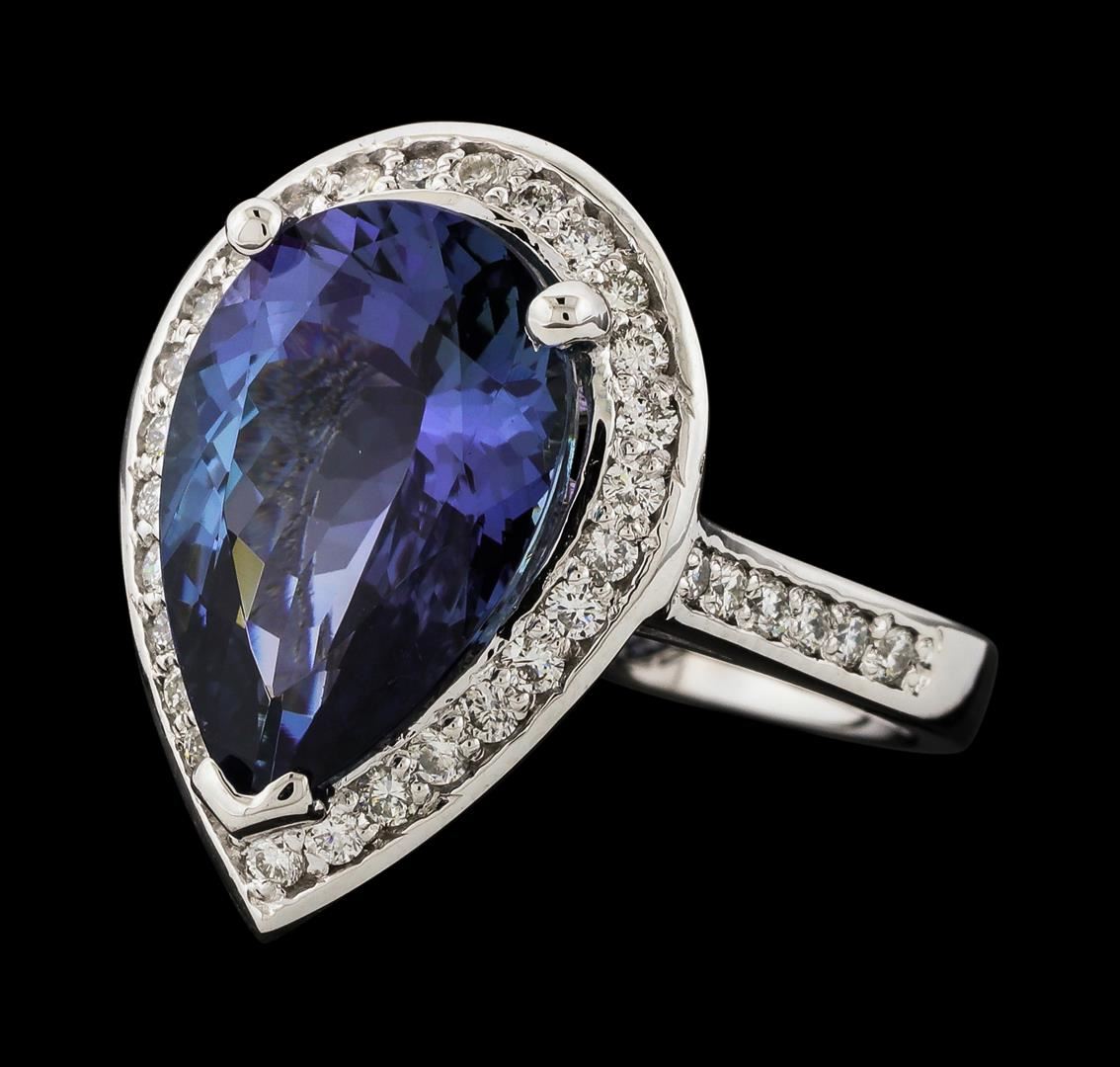 One electronically tested 14KT white gold lady's cast fashion ring with a cathedral shank with a basket halo with a bright polish finish. The featured lady's ring has a shank measuring 2.70 millimeters wide. Identified with markings of 'K14'. Condition is new, good workmanship. Containing: One prong set pear modified brilliant cut natural tanzanite, measuring 15.25 x 10.37 x 6.76mm, (depth est.) approximate weight of 6.87ct., clarity is eye clean, medium, very slightly grayish, violetish blue color, (GIA vB 5/3), cut is very good. Transmitting light with no distortion, transparent. Colored gemstones are presumed to have been subjected to commonly used enhancement processes. Graded in the setting. Forty prong set round brilliant cut diamonds, measuring 1.60 - 1.50 x 0.95mm (depth est.) approximate total weight of 40 Stones = 0.56ct. Graded in the setting. Clarity VS-2 to SI-2. Color: G - H Cut Good. Total Weight of Colored Stones 6.87ct.. Total Weight of Diamonds 0.56ct.. Total Weight of Ring 7.40gm. GAS Appraised at $11,095.00.