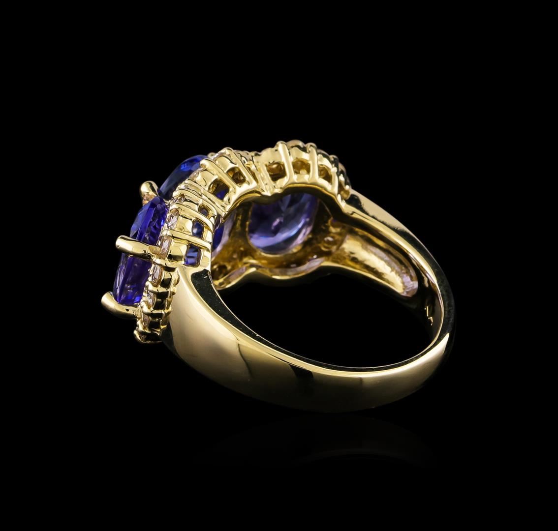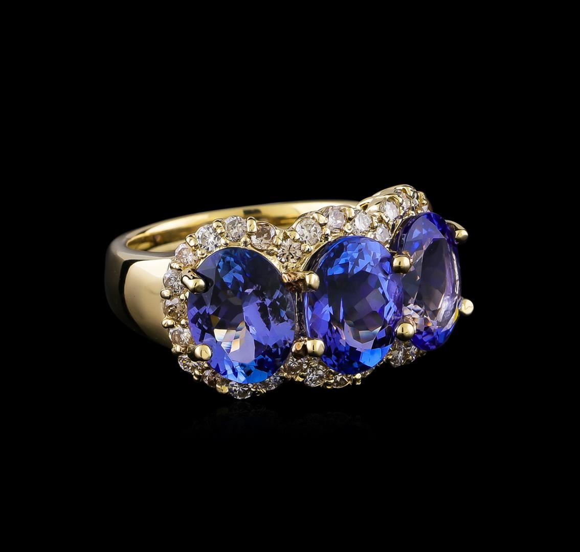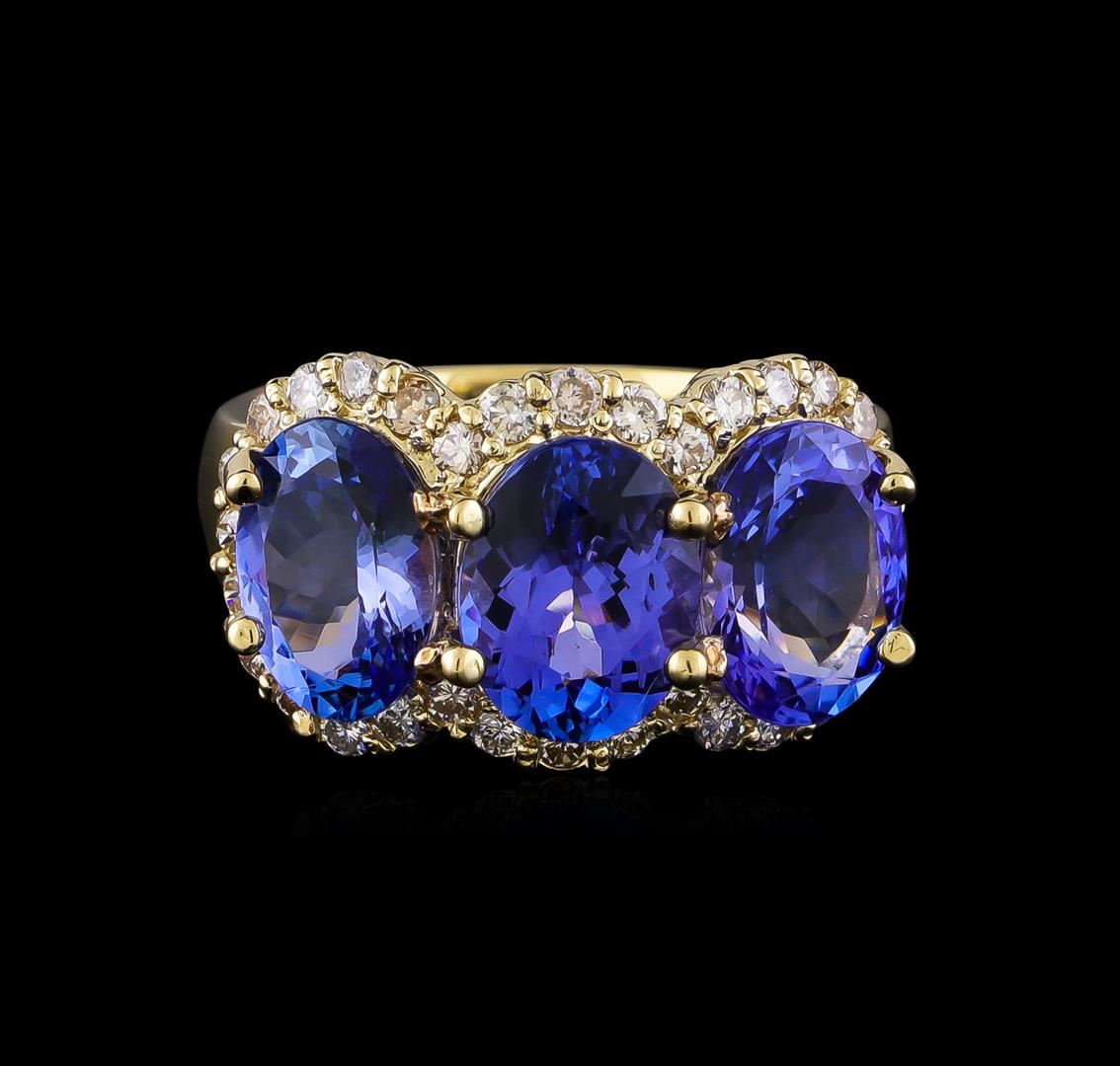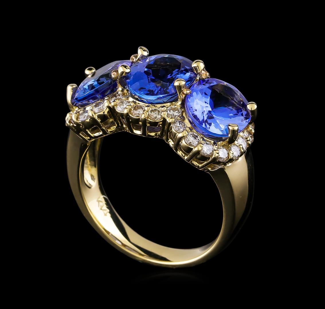 One electronically tested 14KT yellow gold ladies cast tanzanite and diamond ring with a bright polish finish. The ring features a tanzanite trio set within a diamond bezel supported by tapering shoulders, completed by a three millimeter wide band. Identified with markings of "K14". Condition is new, good workmanship. Containing: Three prong set oval mixed cut natural tanzanites, measuring 9.50 x 7.30 x 4.70mm, approximate total weight of 6.87ct., clarity is eye clean, type I, medium, slightly grayish, bluish violet color, (GIA bV 5/2), cut is good. Transmitting light with no distortion, transparent. Measurements & the color grade are an average for the group. Graded in the setting. Tanzanite is a very rare gemstone that is only found in the country of Tanzania. Originally discovered in 1967. Tiffany & Company, named the stone Tanzanite. It is found in the Usumburu Mountains that border the Umba Valley of northern Tanzania. Tanzanite occurs in gray, brown, violet, blue, reddish-purple, & green. The gem is interesting because of its exceptional pleochroism. Rotated in different directions a tanzanite will exhibit multiple changes of color. Tanzanite has a low tolerance to ultrasonic cleaning, and should not be cleaned using this method. Thirty-Two prong set round brilliant cut diamonds, measuring 1.80 - 1.80 x 1.08mm (depth est.) approximate total weight of 32 Stones = 0.72ct. Color & clarity grade are an average for the group. Graded in the setting. Clarity: SI-2 to I-1. Color: H - J. Total Weight of Colored Stones 6.87ct. Total Weight of Diamonds 0.72ct. Total Weight of Ring 8.66gm. AIG Appraised at $14,450.00.