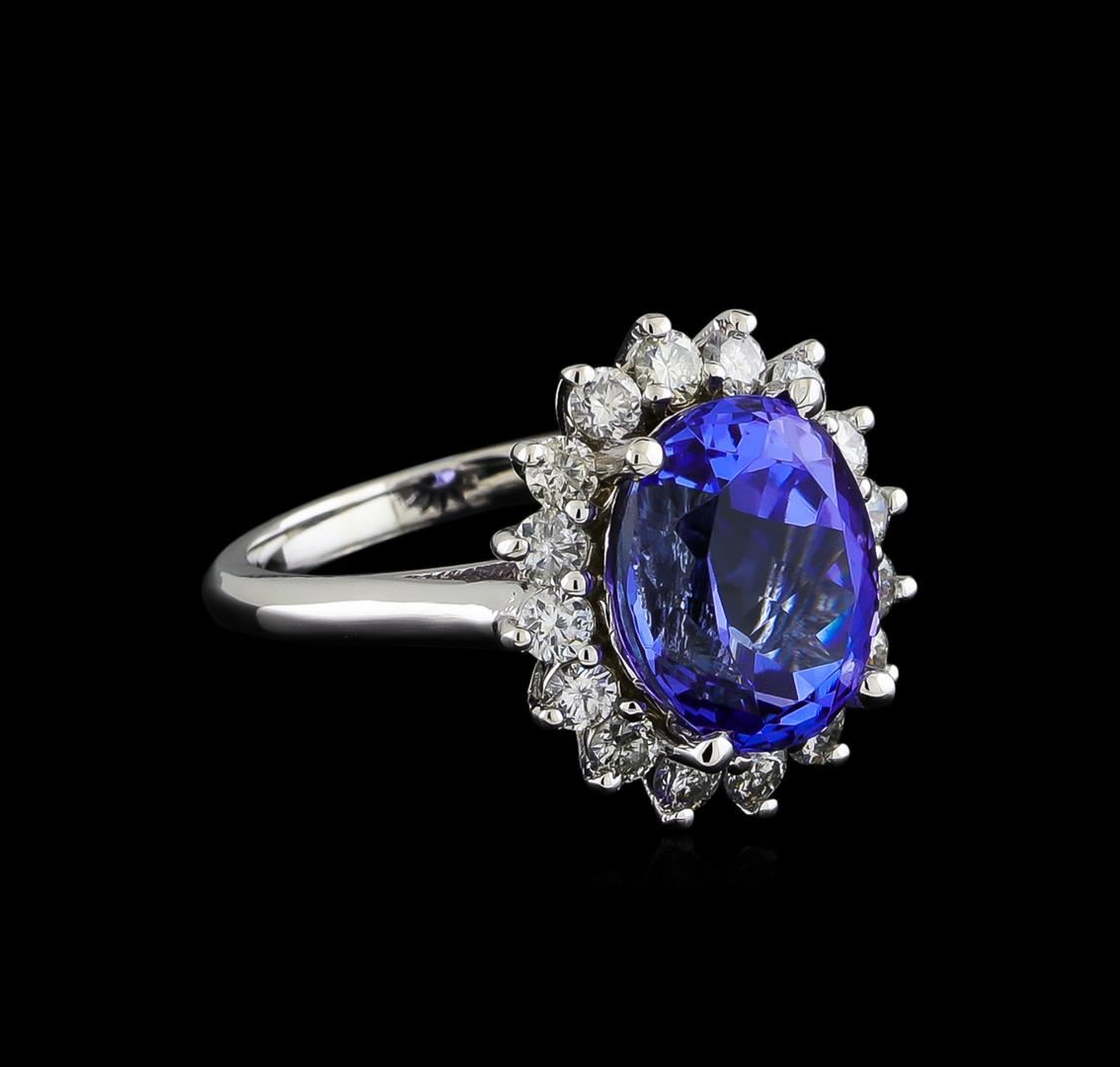 One electronically tested 14KT white gold ladies cast tanzanite and diamond ring with a bright polish finish. The featured tanzanite is set within a diamond floret supported by a ribbed under gallery, completed by a two millimeter wide band. Identified with markings of "14K". Condition is new, good workmanship. Containing: One prong set oval mixed cut natural tanzanite, measuring 12.00 x 9.70 x 7.50mm, 12%. bulge factor, approximate weight of 6.88ct., clarity is eye clean, type I, medium dark, very slightly grayish, bluish violet color, (GIA bV 6/3), cut is good. Transmitting light with no distortion, transparent. Colored Stone Grading Report attached. Graded in the setting. Tanzanite is a very rare gemstone that is only found in the country of Tanzania. Originally discovered in 1967. Tiffany & Company, named the stone Tanzanite. It is found in the Usumburu Mountains that border the Umba Valley of northern Tanzania. Tanzanite occurs in gray, brown, violet, blue, reddish-purple, & green. The gem is interesting because of its exceptional pleochroism. Rotated in different directions a tanzanite will exhibit multiple changes of color. Tanzanite has a low tolerance to ultrasonic cleaning, and should not be cleaned using this method. Sixteen prong set round brilliant cut diamonds, measuring 2.60 - 2.50 x 1.53mm (depth est.) approximate. Total Weight of 16 Stones = 1.03ct. Graded in the setting. Clarity: I-1 to I-2. Color: G - I. Total Weight of Colored Stones 6.88ct. Total Weight of Diamonds 1.03ct. Total Weight of Ring 6.74gm. AIG Appraised at $17,840.00.