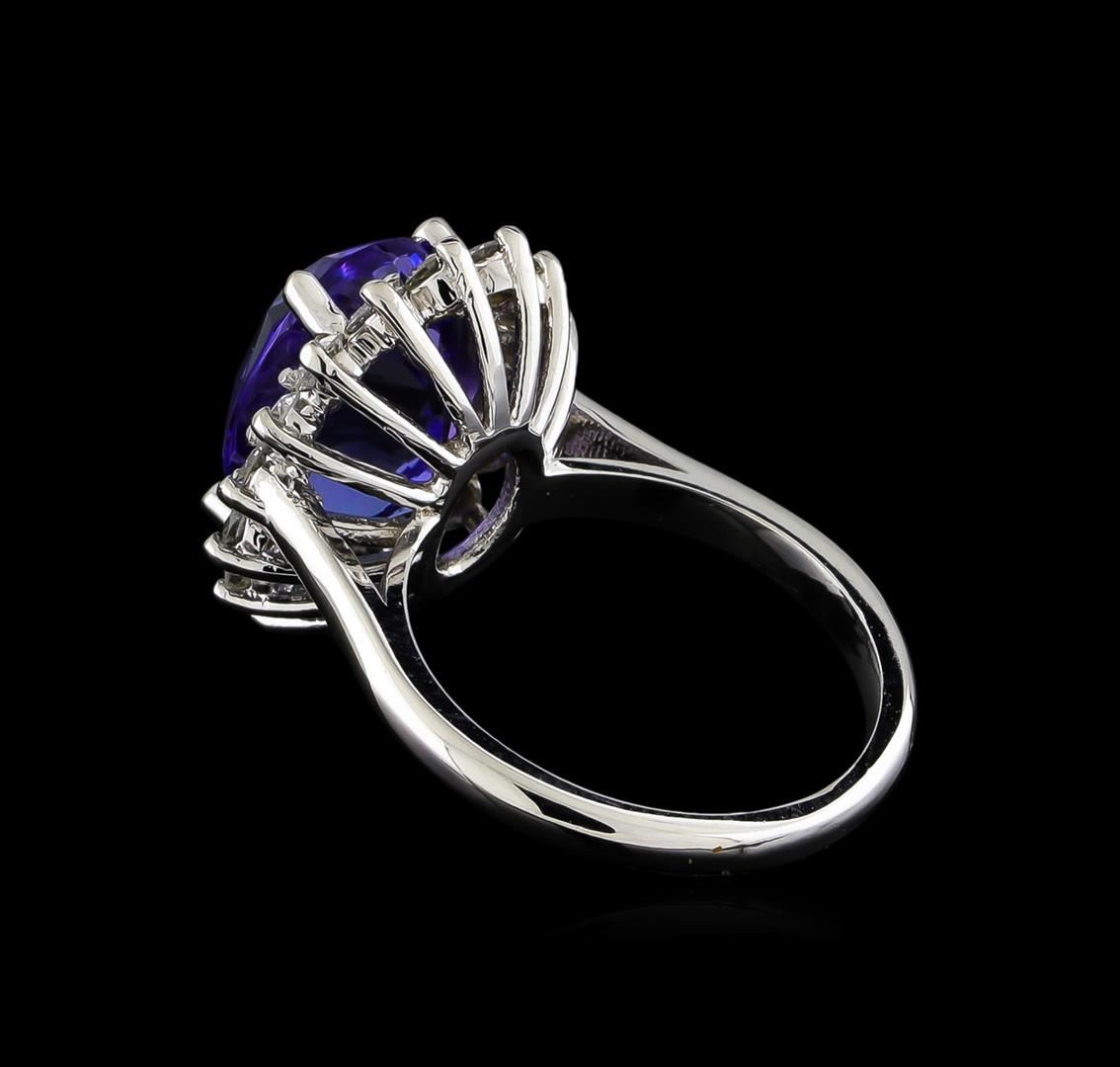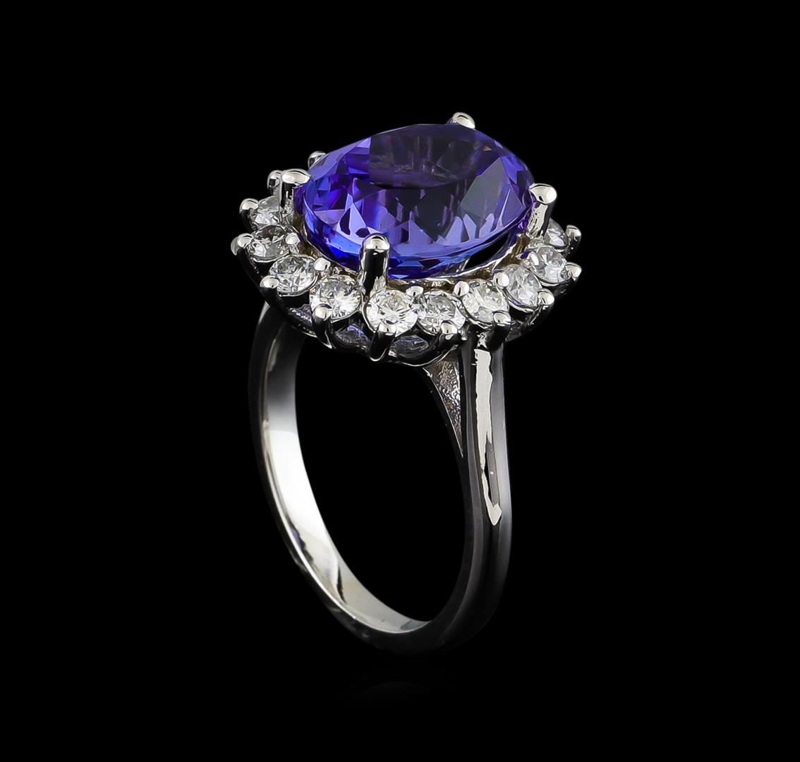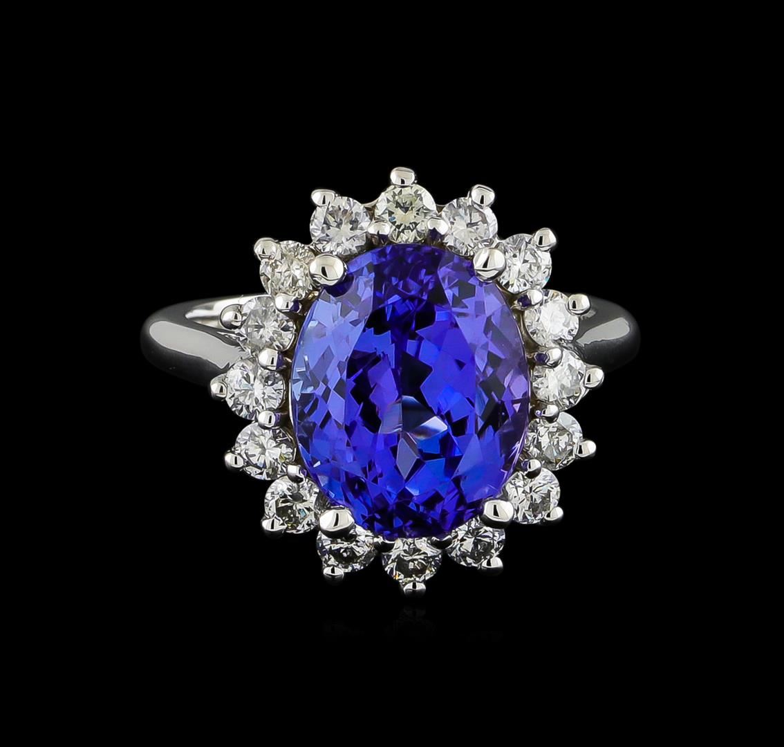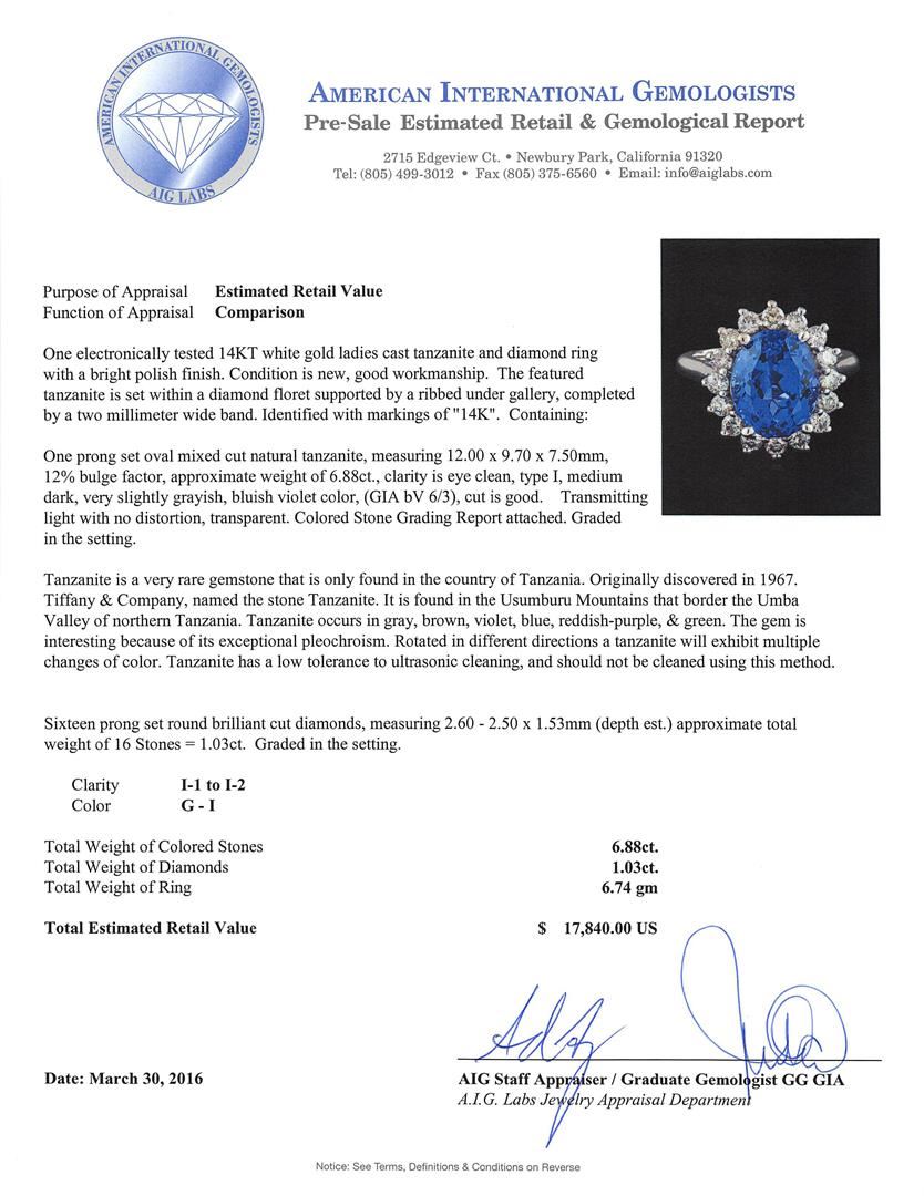 One electronically tested 14KT white gold ladies cast tanzanite and diamond ring with a bright polish finish. The featured tanzanite is set within a diamond floret supported by a ribbed under gallery, completed by a two millimeter wide band. Identified with markings of "14K". Condition is new, good workmanship. Containing: One prong set oval mixed cut natural tanzanite, measuring 12.00 x 9.70 x 7.50mm, 12%. bulge factor, approximate weight of 6.88ct., clarity is eye clean, type I, medium dark, very slightly grayish, bluish violet color, (GIA bV 6/3), cut is good. Transmitting light with no distortion, transparent. Colored Stone Grading Report attached. Graded in the setting. Tanzanite is a very rare gemstone that is only found in the country of Tanzania. Originally discovered in 1967. Tiffany & Company, named the stone Tanzanite. It is found in the Usumburu Mountains that border the Umba Valley of northern Tanzania. Tanzanite occurs in gray, brown, violet, blue, reddish-purple, & green. The gem is interesting because of its exceptional pleochroism. Rotated in different directions a tanzanite will exhibit multiple changes of color. Tanzanite has a low tolerance to ultrasonic cleaning, and should not be cleaned using this method. Sixteen prong set round brilliant cut diamonds, measuring 2.60 - 2.50 x 1.53mm (depth est.) approximate. Total Weight of 16 Stones = 1.03ct. Graded in the setting. Clarity: I-1 to I-2. Color: G - I. Total Weight of Colored Stones 6.88ct. Total Weight of Diamonds 1.03ct. Total Weight of Ring 6.74gm. AIG Appraised at $17,840.00.