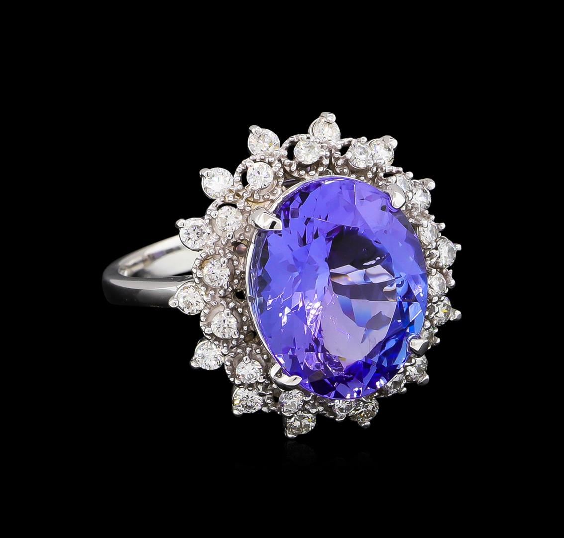 One electronically tested 14KT white gold lady's cast fashion ring with a double basket halo with a bright polish with milgrain detailing finish. The featured lady's ring has a shank measuring 2.62 millimeters wide. Identified with markings of "14K". Condition is new, good workmanship. Containing: One prong set oval modified brilliant cut natural tanzanite, measuring 13.64 x 11.03 x 6.80mm, approximate weight of 6.90ct., clarity is eye clean, type I, medium, moderately strong, bluish violet color, (GIA bV 5/4), cut is very good. Transmitting light with no distortion, transparent. Colored gemstones are presumed to have been subjected to commonly used enhancement processes. Graded in the setting. Fourteen prong set round brilliant cut diamonds, measuring 1.90 - 1.80 x 1.13mm (depth est.) approximate total weight of 14 Stones = 0.33ct. Graded in the setting. Clarity: VS-2 to SI-1. Color: H - I. Cut Good Fourteen prong set round brilliant cut diamonds, measuring 1.70 - 1.60 x 0.99mm (depth est.) approximate total weight of 14 Stones = 0.23ct. Graded in the setting. Clarity: VS-2 to SI-1. Color: H - I. Cut Good. Total Weight of Colored Stones 6.90ct. Total Weight of Diamonds 0.56ct. Total Weight of Ring 6.60gm. GAS Appraised at $12,960.00.