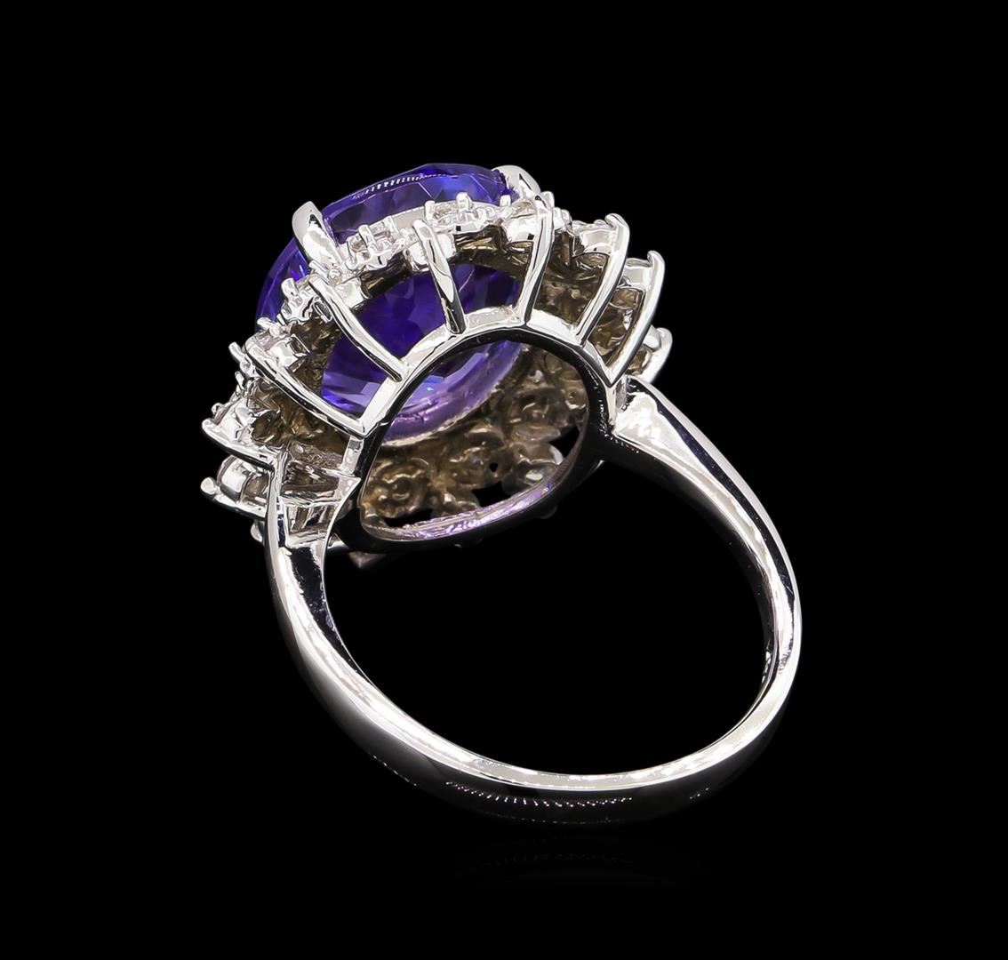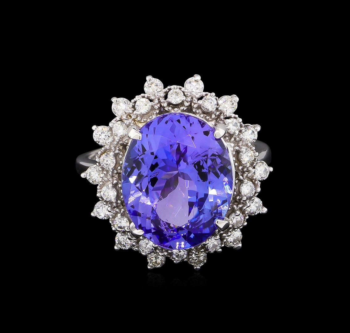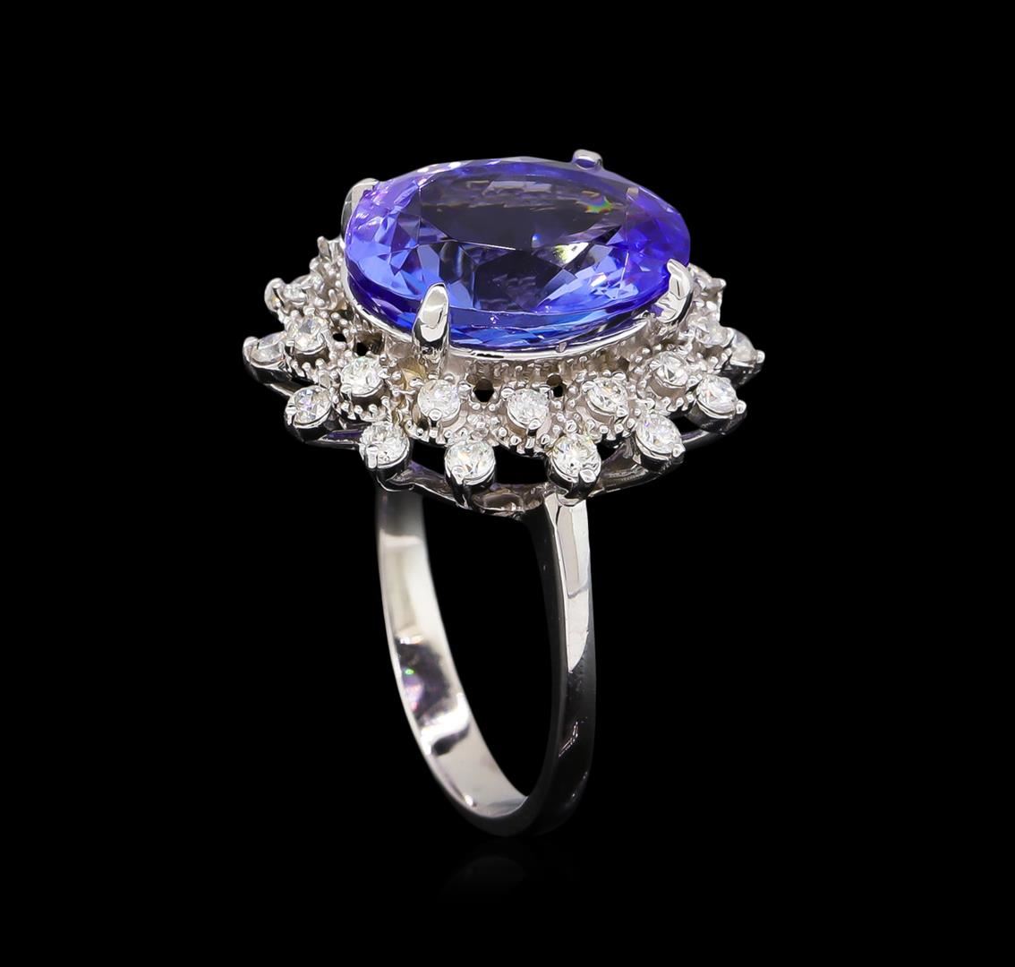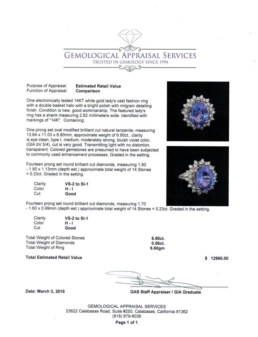 One electronically tested 14KT white gold lady's cast fashion ring with a double basket halo with a bright polish with milgrain detailing finish. The featured lady's ring has a shank measuring 2.62 millimeters wide. Identified with markings of "14K". Condition is new, good workmanship. Containing: One prong set oval modified brilliant cut natural tanzanite, measuring 13.64 x 11.03 x 6.80mm, approximate weight of 6.90ct., clarity is eye clean, type I, medium, moderately strong, bluish violet color, (GIA bV 5/4), cut is very good. Transmitting light with no distortion, transparent. Colored gemstones are presumed to have been subjected to commonly used enhancement processes. Graded in the setting. Fourteen prong set round brilliant cut diamonds, measuring 1.90 - 1.80 x 1.13mm (depth est.) approximate total weight of 14 Stones = 0.33ct. Graded in the setting. Clarity: VS-2 to SI-1. Color: H - I. Cut Good Fourteen prong set round brilliant cut diamonds, measuring 1.70 - 1.60 x 0.99mm (depth est.) approximate total weight of 14 Stones = 0.23ct. Graded in the setting. Clarity: VS-2 to SI-1. Color: H - I. Cut Good. Total Weight of Colored Stones 6.90ct. Total Weight of Diamonds 0.56ct. Total Weight of Ring 6.60gm. GAS Appraised at $12,960.00.