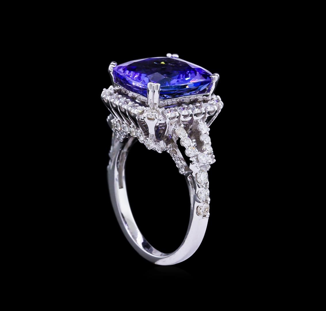 One electronically tested 14KT white gold lady's combination cast & assembled fashion ring with a cathedral shank with a halo with a bright polish finish. The featured lady's ring has a shank measuring 1.90 millimeters wide. Identified with markings of "K14". Condition is new, good workmanship. Containing: One prong set square cushion modified brilliant cut natural tanzanite, measuring 11.94 x 11.90 x 6.72mm, approximate weight of 6.90ct., clarity is eye clean, type I, medium, moderately strong, bluish violet color, (GIA bV 5/4), cut is very good. Transmitting light with no distortion, transparent. Colored gemstones are presumed to have been subjected to commonly used enhancement processes. Graded in the setting. Twenty-Six prong set round brilliant cut diamonds, measuring 1.90 - 1.80 x 1.15mm (depth est.) approximate total weight of 26 Stones = 0.64ct. Graded in the setting. Clarity: SI-1 to I-1. Color: H - I. Cut Good Thirty prong set round brilliant cut diamonds, measuring 1.50 - 1.40 x 0.91mm (depth est.) approximate total weight of 30 Stones = 0.35ct. Graded in the setting. Clarity: SI-1 to I-1. Color: H - I. Cut Good Twelve prong set round brilliant cut diamonds, measuring 1.10 - 1.05 x 0.69mm (depth est.) approximate total weight of 12 Stones = 0.06ct. Graded in the setting. Clarity: SI-1 to I-1. Color: H - I. Cut Good. Total Weight of Colored Stones 6.90ct. Total Weight of Diamonds 1.05ct. Total Weight of Ring 7.10gm. GAS Appraised at $14,005.00.