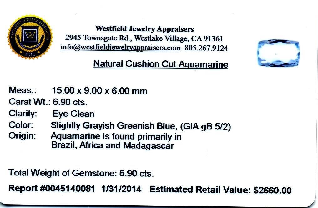 6.90ct. Natural Cushion Cut Aquamarine Westfield Appraised at $2,660.00.