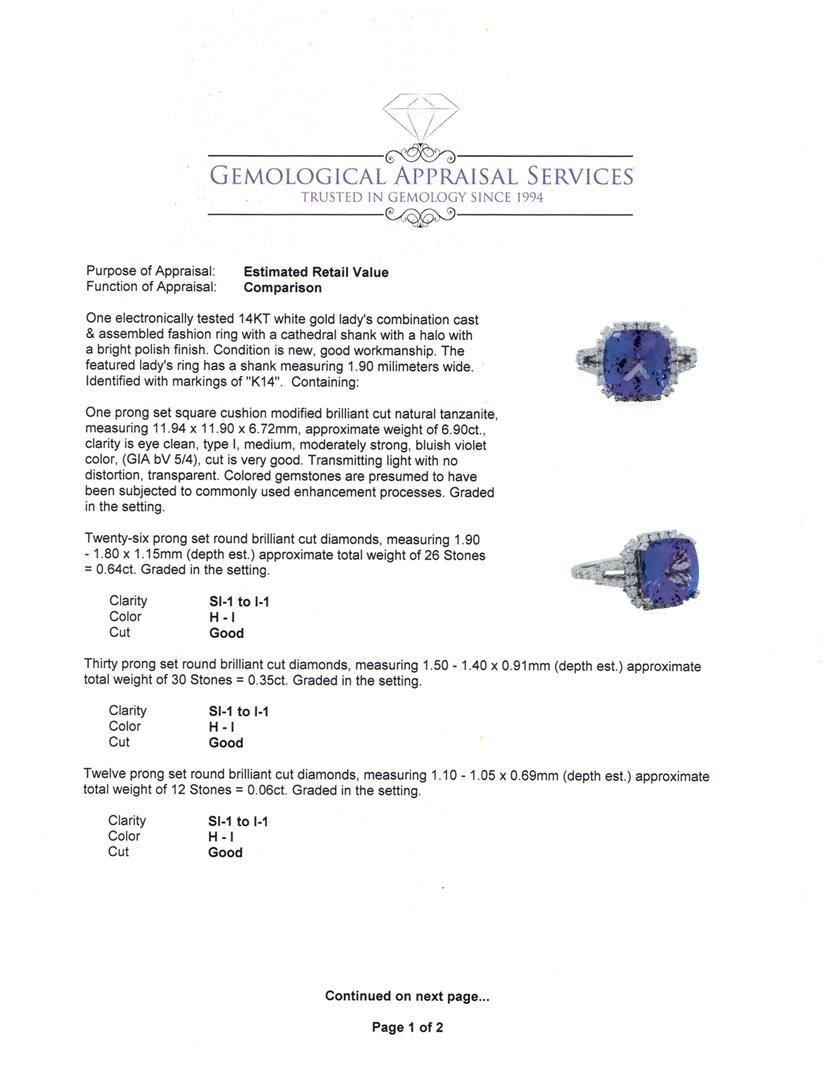 One electronically tested 14KT white gold lady's combination cast & assembled fashion ring with a cathedral shank with a halo with a bright polish finish. The featured lady's ring has a shank measuring 1.90 millimeters wide. Identified with markings of "K14". Condition is new, good workmanship. Containing: One prong set square cushion modified brilliant cut natural tanzanite, measuring 11.94 x 11.90 x 6.72mm, approximate weight of 6.90ct., clarity is eye clean, type I, medium, moderately strong, bluish violet color, (GIA bV 5/4), cut is very good. Transmitting light with no distortion, transparent. Colored gemstones are presumed to have been subjected to commonly used enhancement processes. Graded in the setting. Twenty-Six prong set round brilliant cut diamonds, measuring 1.90 - 1.80 x 1.15mm (depth est.) approximate total weight of 26 Stones = 0.64ct. Graded in the setting. Clarity: SI-1 to I-1. Color: H - I. Cut Good Thirty prong set round brilliant cut diamonds, measuring 1.50 - 1.40 x 0.91mm (depth est.) approximate total weight of 30 Stones = 0.35ct. Graded in the setting. Clarity: SI-1 to I-1. Color: H - I. Cut Good Twelve prong set round brilliant cut diamonds, measuring 1.10 - 1.05 x 0.69mm (depth est.) approximate total weight of 12 Stones = 0.06ct. Graded in the setting. Clarity: SI-1 to I-1. Color: H - I. Cut Good. Total Weight of Colored Stones 6.90ct. Total Weight of Diamonds 1.05ct. Total Weight of Ring 7.10gm. GAS Appraised at $14,005.00.