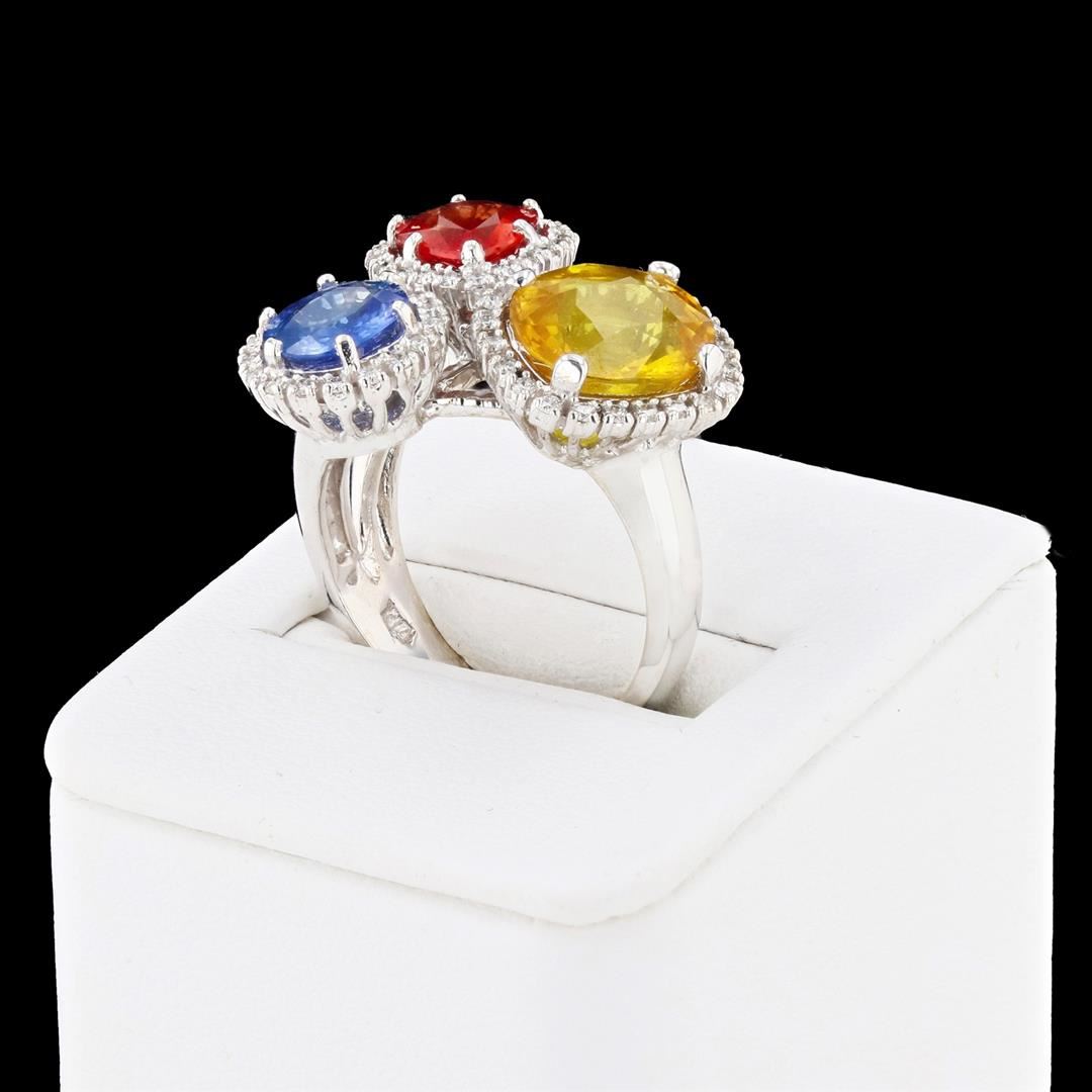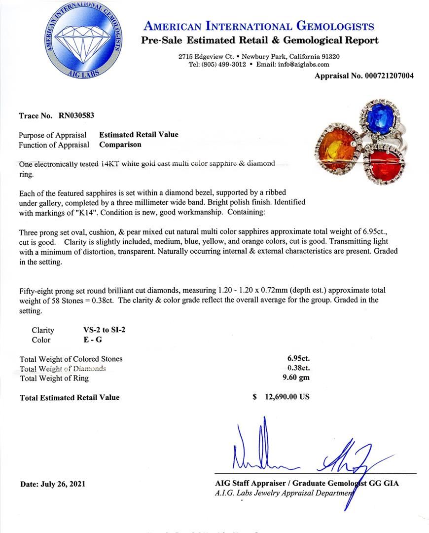 6.95ctw Multi-colored Sapphire and 0.38ctw Diamond 14K White Gold Ring. Please see Photos and Description for all available information. This exceptional ring features a 6.95ctw multi-colored sapphire center stone and 58 round diamonds, totaling 0.38ctw. The color of the sapphires ranges from blue to yellow to orange. The 6.95ctw center stone is surrounded by 58 round diamonds, totaling 0.38ctw, in a 14K white gold band. The ring's unique design makes it a truly one-of-a-kind piece. This ring is available in a size 6 3/4.