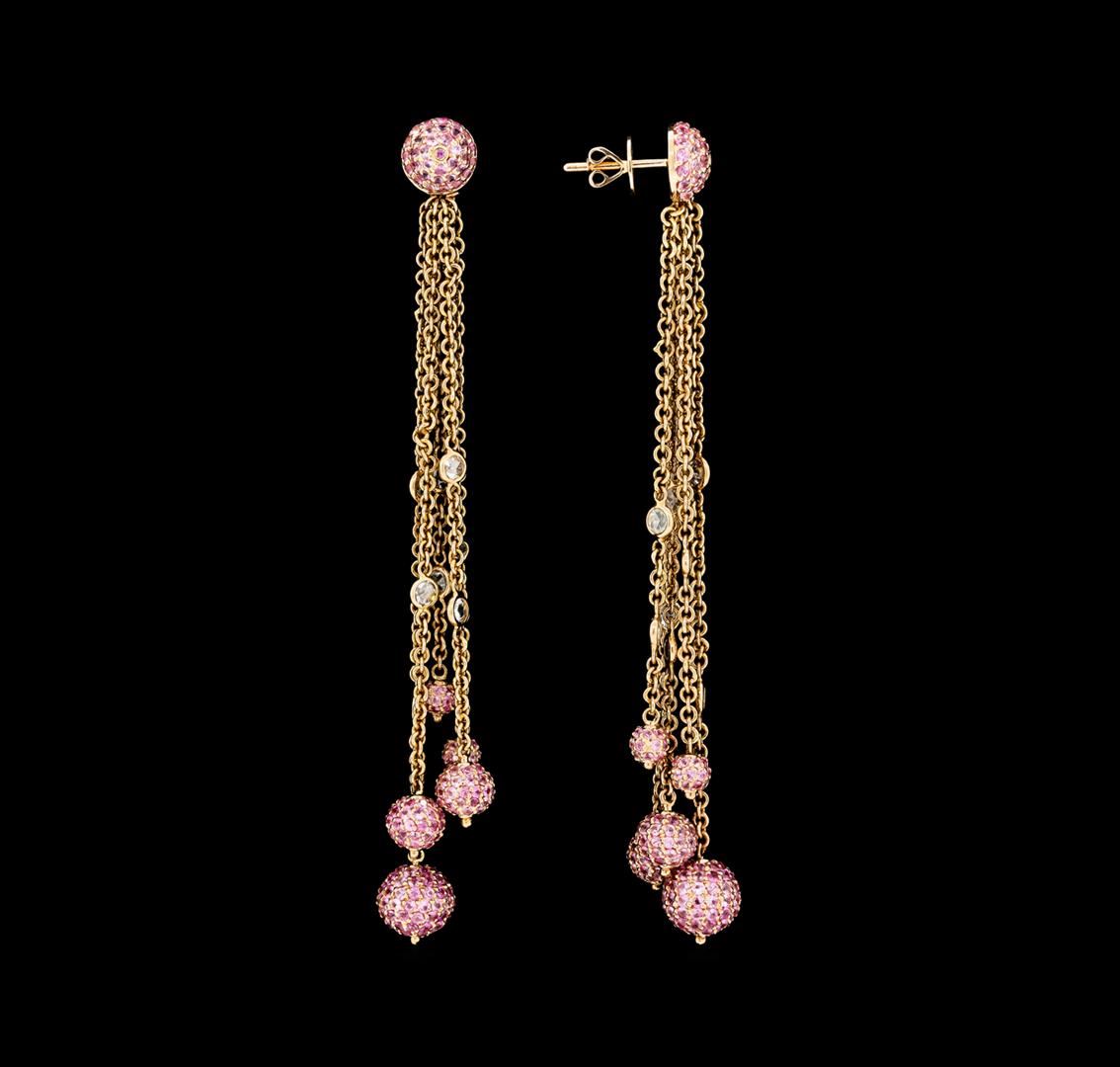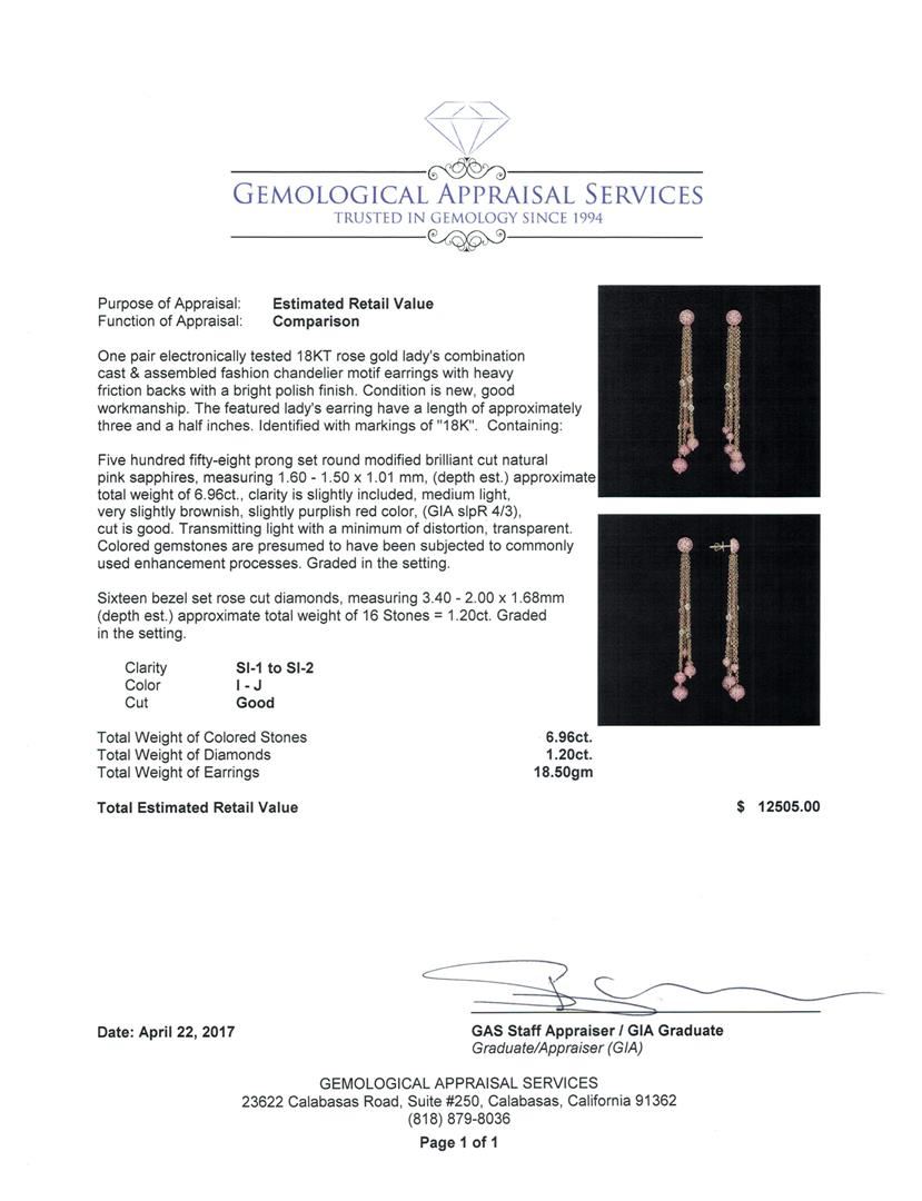 One pair electronically tested 18KT rose gold lady's combination cast & assembled fashion chandelier motif earrings with heavy friction backs with a bright polish finish. The featured lady's earring have a length of approximately three and a half inches. Identified with markings of '18K'. Condition is new, good workmanship. Containing: Five hundred fifty-eight prong set round modified brilliant cut natural pink sapphires, measuring 1.60 - 1.50 x 1.01 mm, (depth est.) approximate total weight of 6.96ct., clarity is slightly included, medium light, very slightly brownish, slightly purplish red color, (GIA slpR 4/3), cut is good. Transmitting light with a minimum of distortion, transparent. Colored gemstones are presumed to have been subjected to commonly used enhancement processes. Graded in the setting. Sixteen bezel set rose cut diamonds, measuring 3.40 - 2.00 x 1.68mm (depth est.) approximate total weight of 16 Stones = 1.20ct. Graded in the setting. Color I - J Clarity SI-1 to SI-2 Cut Good. Total Weight of Colored Stones 6.96ct.. Total Weight of Diamonds 1.20ct.. Total Weight of Earrings 18.50gm GAS Appraised at $12505.00. GAS Appraised at $12,505.00.