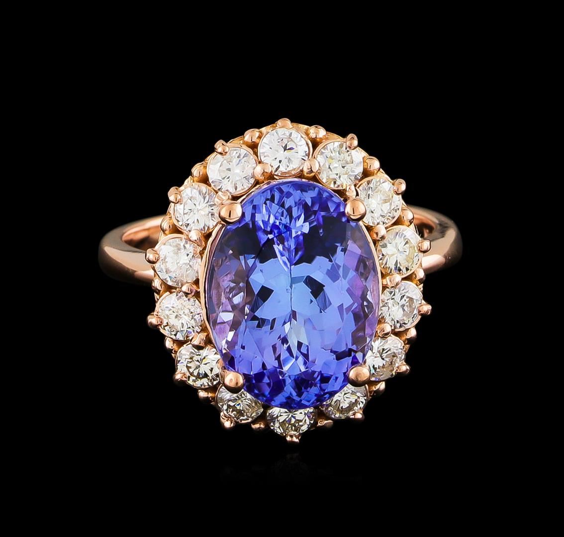 One electronically tested 14KT rose gold ladies cast tanzanite and diamond ring with a bright polish finish. The featured tanzanite is set within a diamond bezel supported by an elaborate lattice under gallery, completed by a two millimeter wide band. Identified with markings of "K14". Condition is new, good workmanship. Containing: One prong set oval mixed cut natural tanzanite, measuring 12.80 x 9.50 x 7.90mm, 3%. bulge factor, approximate weight of 6.96ct., clarity is eye clean, type I, medium dark, very slightly grayish, bluish violet color, (GIA bV 6/3), cut is good. Transmitting light with no distortion, transparent. Colored Stone Grading Report attached. Graded in the setting. Tanzanite is a very rare gemstone that is only found in the country of Tanzania. Originally discovered in 1967. Tiffany & Company, named the stone Tanzanite. It is found in the Usumburu Mountains that border the Umba Valley of northern Tanzania. Tanzanite occurs in gray, brown, violet, blue, reddish-purple, & green. The gem is interesting because of its exceptional pleochroism. Rotated in different directions a tanzanite will exhibit multiple changes of color. Tanzanite has a low tolerance to ultrasonic cleaning, and should not be cleaned using this method. Fourteen prong set round brilliant cut diamonds, measuring 2.70 - 2.70 x 1.62mm (depth est.) approximate total weight of 14 Stones = 1.02ct. Graded in the setting. Clarity: SI-2 to I-2. Color: G - I. Total Weight of Colored Stones 6.96ct. Total Weight of Diamonds 1.02ct. Total Weight of Ring 6.73gm. AIG Appraised at $18,290.00.
