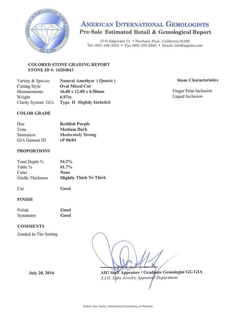 One electronically tested 14KT white gold ladies cast amethyst and diamond ring with a bright polish finish. The featured amethyst is set within a diamond floret supported by a ribbed under gallery, completed by a two millimeter wide band. Identified with markings of '14K'. Condition is new, good workmanship. Containing: One prong set oval mixed cut natural amethyst, measuring 16.00 x 12.00 x 6.50mm, approximate weight of 6.97ct., clarity is slightly included, type II, medium dark, moderately strong, reddish purple color, (GIA rP 6/4), cut is good. Transmitting light with a minimum of distortion, transparent. Naturally occurring internal & external characteristics are present. Colored Stone Grading Report attached. Graded in the setting. Twenty prong set round brilliant cut diamonds, measuring 2.40 - 2.30 x 1.41mm (depth est.) approximate total weight of 20 Stones = 1.00ct. The clarity grade reflects the entire range of clarity for this group. Graded in the setting. Clarity SI-1 to I-2. Color: G - I. Total Weight of Colored Stones 6.97ct.. Total Weight of Diamonds 1.00ct.. Total Weight of Ring 7.59gm. AIG Appraised at $3,785.00.